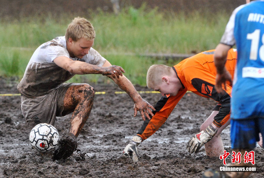 近日,在芬蘭舉行了一場沼澤足球世界杯賽。選手們在泥漿里進行足球比賽,踢得不亦樂乎。