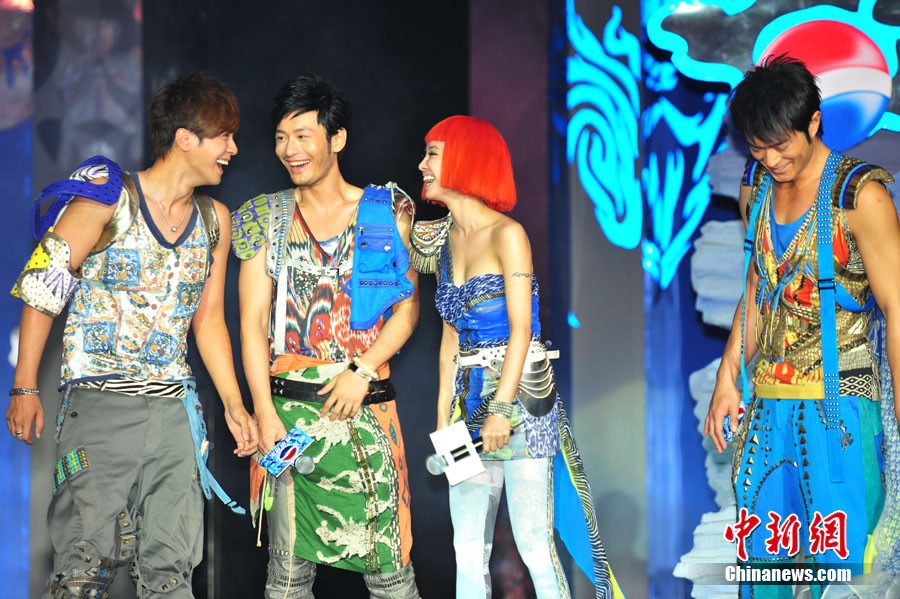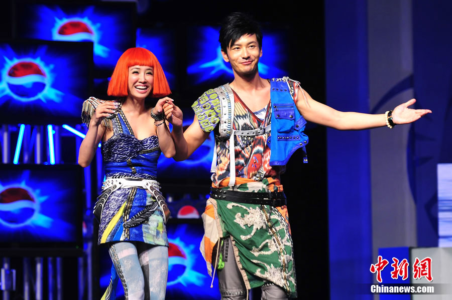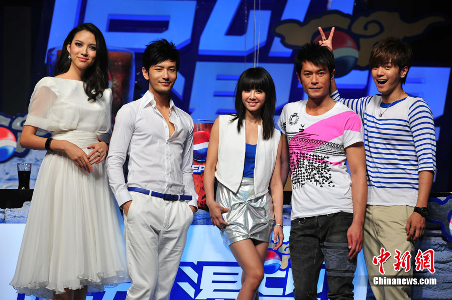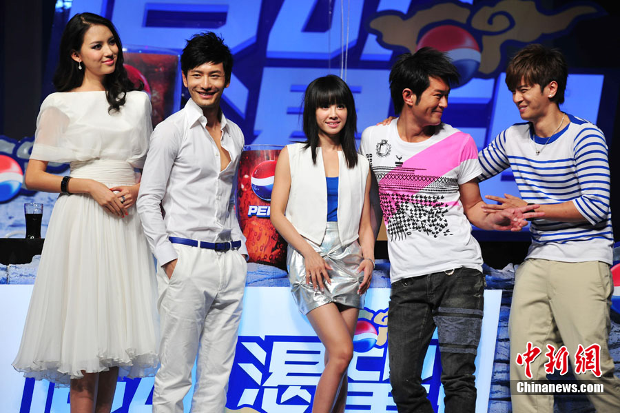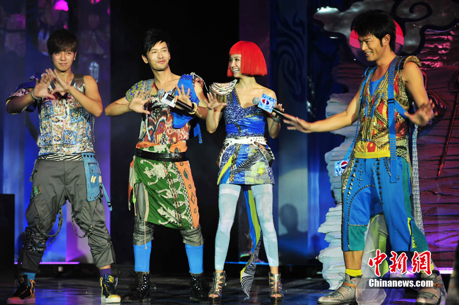 7月21日,國際某飲料巨頭在北京召開新聞發布會,最新主題廣告震撼首播。古天樂、羅志祥、黃曉明、蔡依林身著華麗戰袍駕駛戰車亮相,他們以師兄弟的身份打造全新“西游記”,“世界小姐選美大賽冠軍”張梓琳更是以蜘蛛精身份出演。中新社記者 富田 李學仕 攝