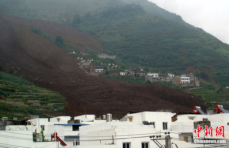 7月27日凌晨5時(shí)許,因連日來(lái)的持續(xù)強(qiáng)降雨和暴晴天氣,四川雅安市漢源縣萬(wàn)工鄉(xiāng)雙合村一組萬(wàn)工集鎮(zhèn)后背山(小地名二蠻山)突發(fā)滑坡,方量約10萬(wàn)方,造成萬(wàn)工集鎮(zhèn)、雙合一組部分村民房屋垮塌。初步核實(shí)共有58戶(hù)房屋受損、21人失蹤。初步勘明強(qiáng)降雨形成的新滑坡推移引發(fā)泥石流,方量約10萬(wàn)方。由于垮滑現(xiàn)場(chǎng)實(shí)施救援較為危險(xiǎn),滑坡暫時(shí)被房屋擋住,隨時(shí)可能推到房屋再次下滑,救援人員已經(jīng)全部撤離。災(zāi)害發(fā)生后,當(dāng)?shù)匮杆僬{(diào)集武警、消防等98人趕赴現(xiàn)場(chǎng)救援,還有230人待命。目前,帳篷、食品、飲用水等救災(zāi)物資已陸續(xù)運(yùn)往臨時(shí)安置點(diǎn),尚未發(fā)現(xiàn)新增失蹤人員。圖為山體垮滑現(xiàn)場(chǎng)。中新社發(fā) 孫浩 攝