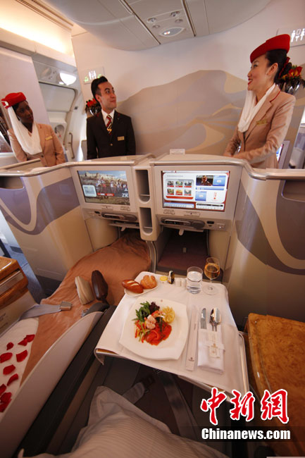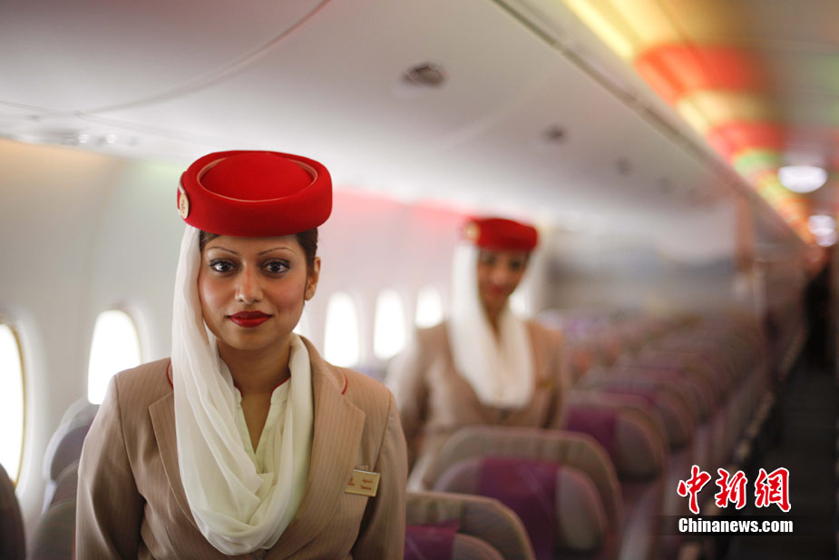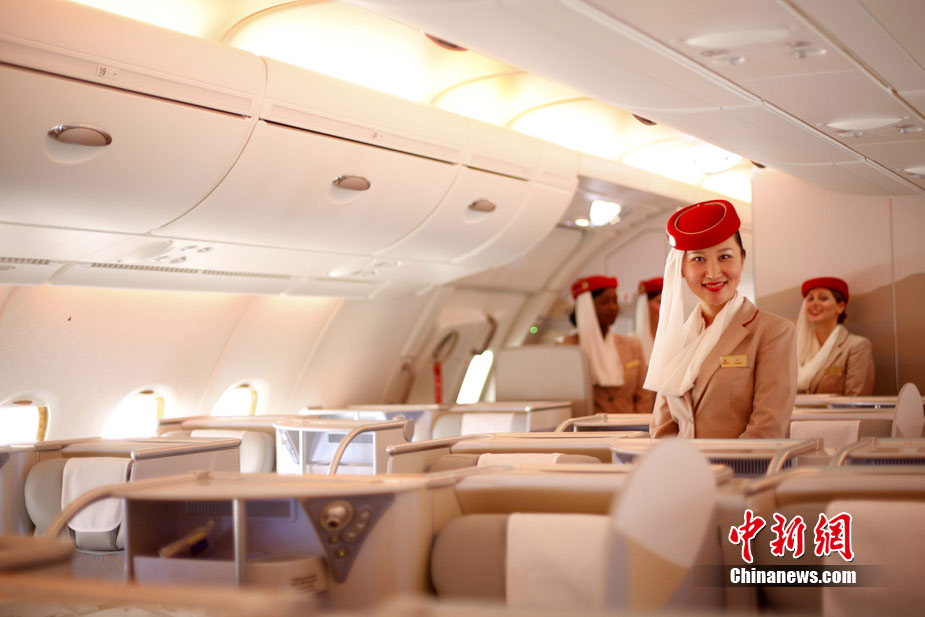 阿航A380 客機頭等艙內共有14個私人套間,設有兩間設備齊全的淋浴房,帶按摩功能的座椅可平躺成床。頭等艙和商務艙乘客還能享受如私人會所般、提供冷熱小點和酒品飲料的機上酒廊社交區。商務艙的座椅可放平成2米長的床,而經濟艙的座椅可以傾斜多達33英寸,讓乘客自由舒展身體。所有艙位的乘客都可以享用阿航多達1200個頻道的數碼寬屏機上娛樂系統,該系統提供空中娛樂節目。圖為阿聯酋航空空客A380上的空姐。中新社記者 盛佳鵬 攝