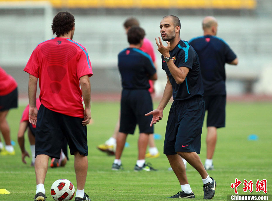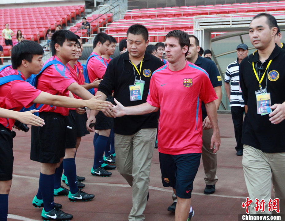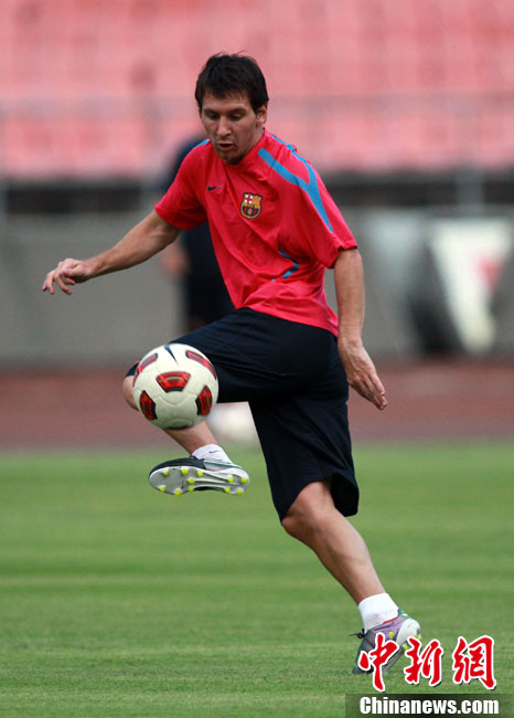 8月6日,巴塞羅那俱樂部在北京工人體育館進行了第二次公開訓練課,眾多巴薩球迷也在現場目睹了球隊風采。圖為梅西出場表情輕松。中新社發 杜洋 攝