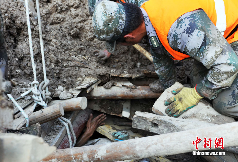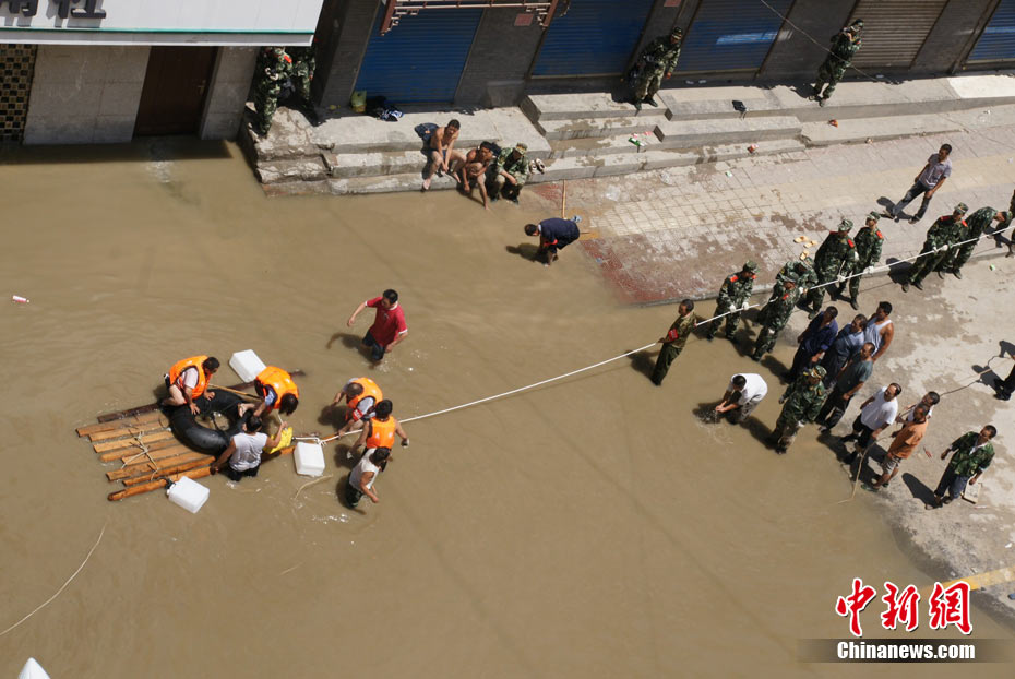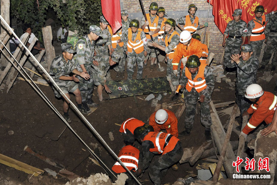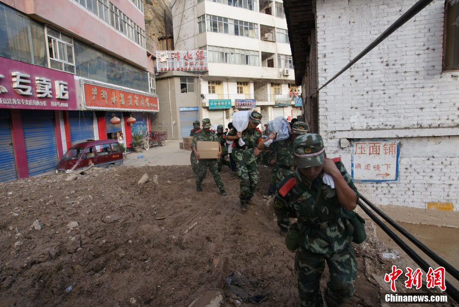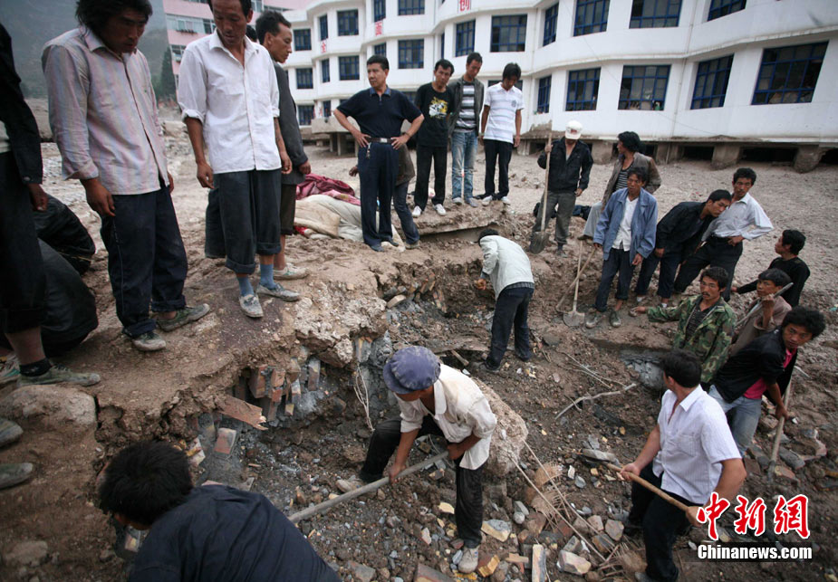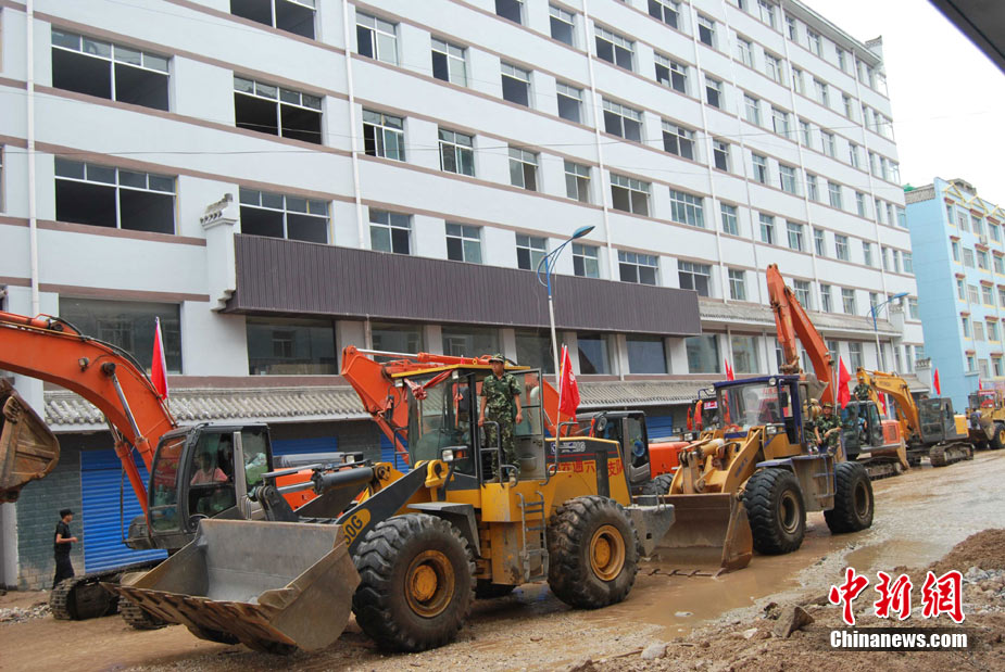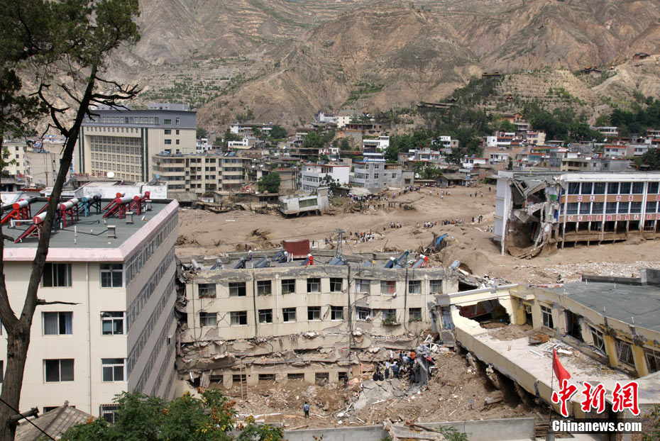 8月8日下午17時58分,白龍江水位有所下降。8月8日凌晨,甘肅省舟曲縣因強降雨引發滑坡泥石流,造成重大人員傷亡,電力、交通、通訊中斷。8月7日22時許,甘肅甘南州舟曲縣出現持續強降雨天氣,暴雨造成舟曲水文站下游100米處的羅家溝發生泥石流,堵塞白龍江,舟曲縣城部分被淹。中新社發 張永進 攝