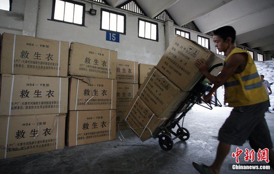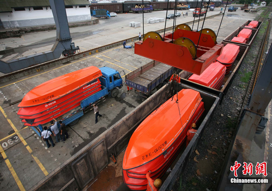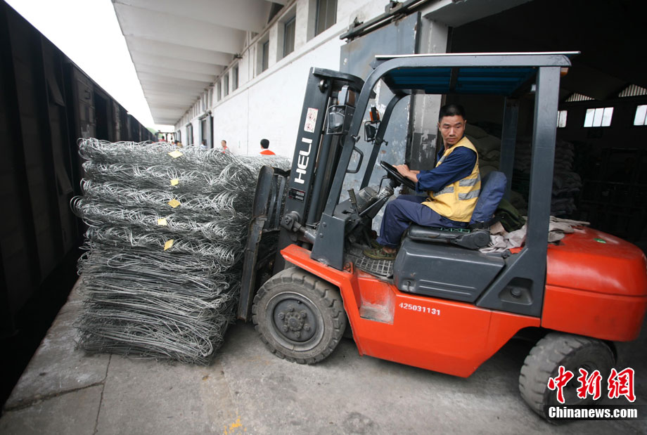 8月21日上午,國家防總緊急調(diào)撥的80艘沖鋒舟,40支橡皮舟、120臺船外機、1萬件救生衣、4000片鉛絲籠網(wǎng)片、4000個鋼絲網(wǎng)兜、500盞查險燈等搶險救災(zāi)物資順利抵達成都火車東站,將立刻分發(fā)運往成都、眉山、樂山、巴中等災(zāi)情嚴重地區(qū)。圖為裝卸工人正在吊裝沖鋒舟。中新社發(fā) 劉忠俊 攝