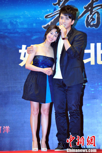 8月25日,電影《芳香之城傳奇》在北京舉行記者會。不老的“紫霞仙子”朱茵攜主演扎西頓珠、張達明、李子雄、張璇、董立范等亮相。朱茵以一襲抹胸短裙亮相,自曝在新片中大轉(zhuǎn)型,飾演一個有天然體香的神秘啞女,男主角扎西頓珠飾演的“富二代”被其吸引后,上演了一段純美姐弟戀。朱茵在接受采訪時坦言自己并不拒絕姐弟戀。圖為朱茵、扎西頓珠現(xiàn)場秀親昵。中新社記者 李學(xué)仕 攝