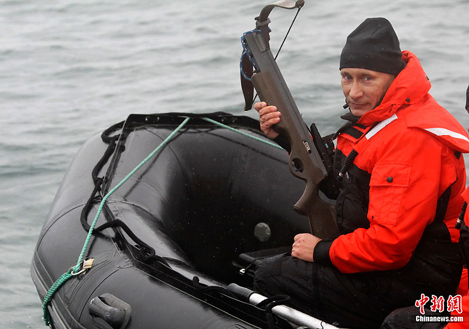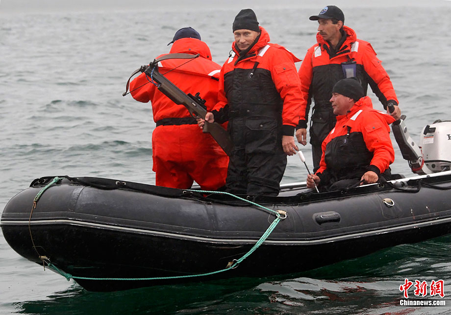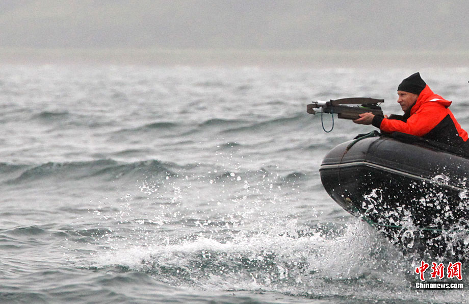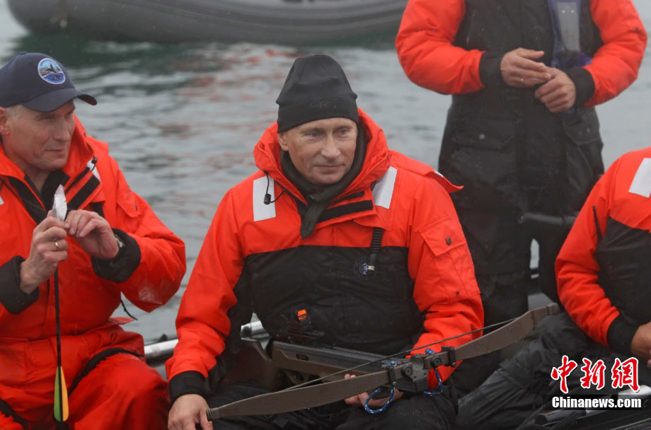當地時間8月25日,俄羅斯總理普京在勘察加半島附近的奧爾加港參與科學考察時,乘坐橡皮艇、手持勁弩,再次秀了一把射飛鏢獵捕灰鯨的風采。