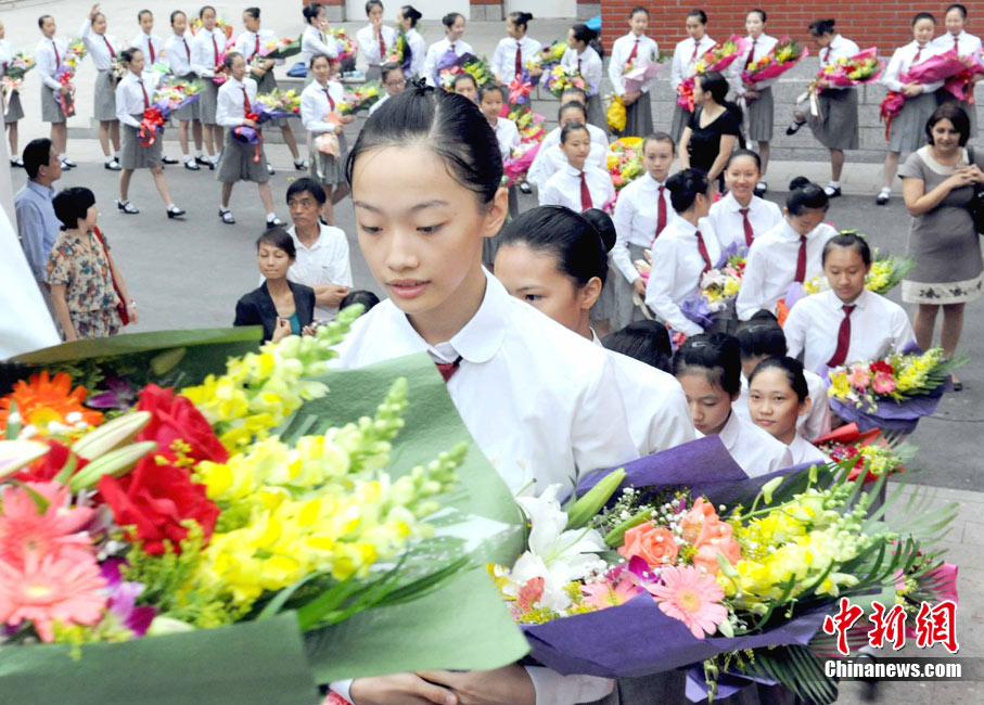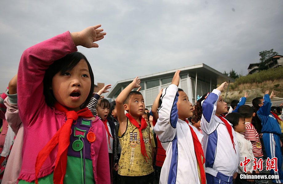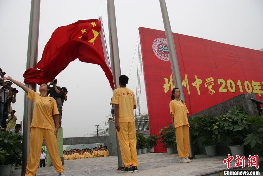 9月1日上午,甘肅舟曲一中轉(zhuǎn)運(yùn)至蘭州、定西的3000余名師生統(tǒng)一開課。圖為舟曲一中甘肅省銀行學(xué)校教學(xué)點(diǎn)學(xué)生參加開學(xué)典禮儀式。中新社記者 張玉璽 攝