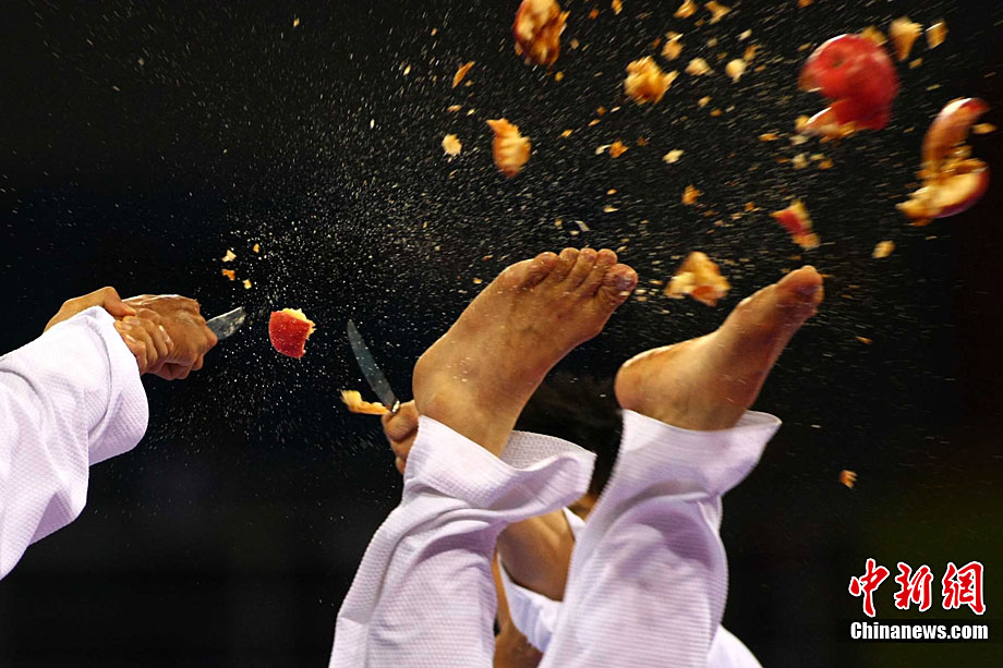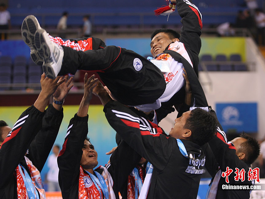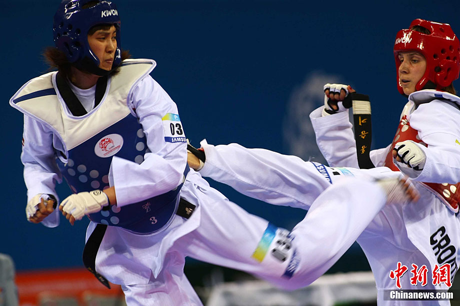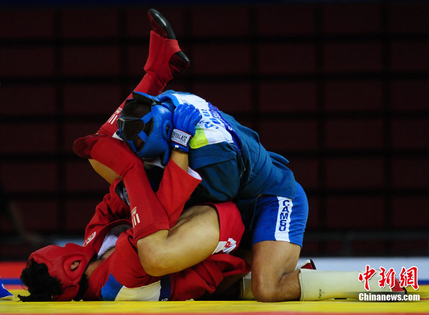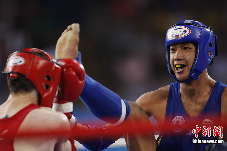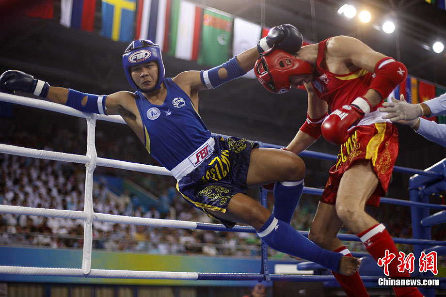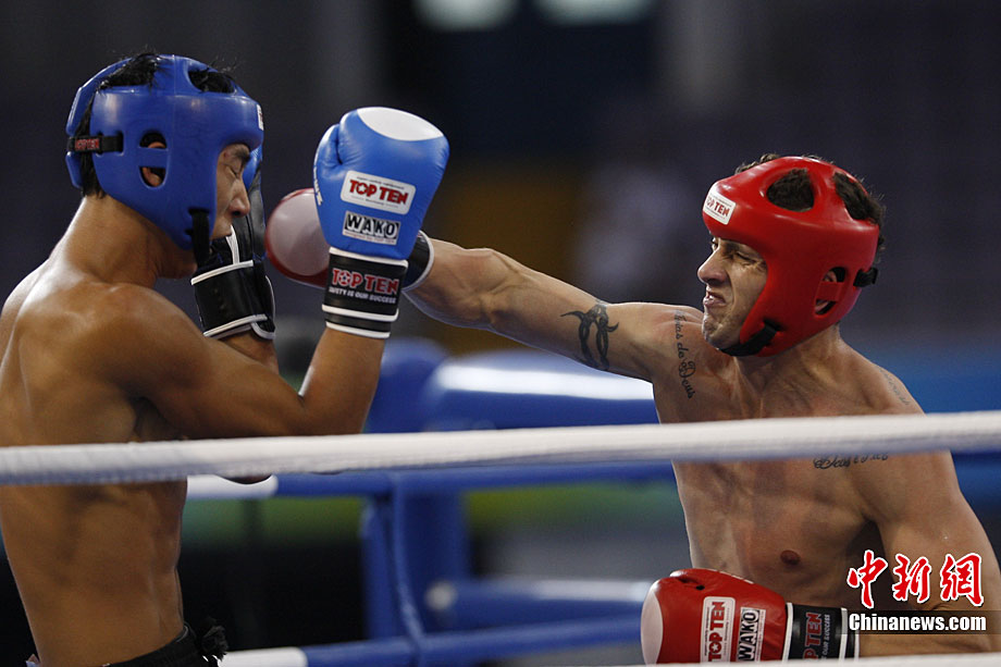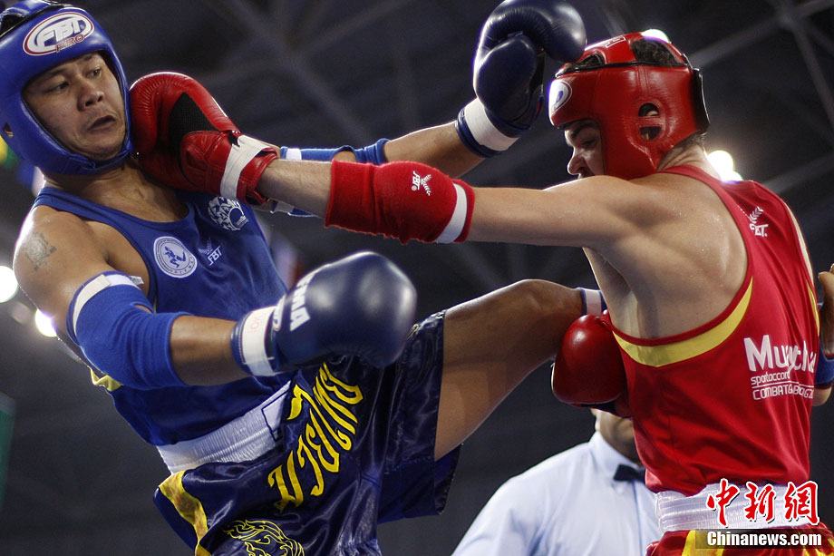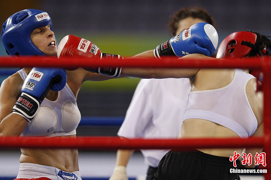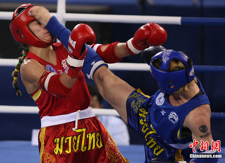 9月2日晚,2010年北京首屆世界武搏運動會進行了泰拳項目11個級別的的決賽。泰拳女子60公斤級決賽中,紅方澳大利亞選手LewisCaleySimon對陣藍方秘魯選手ShevchenkoValentina,最終澳大利亞選手不敵對手,收獲銀牌。中新社發 蘇丹 攝