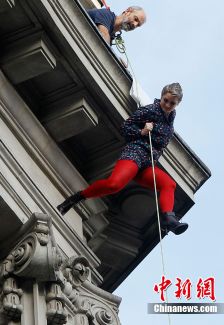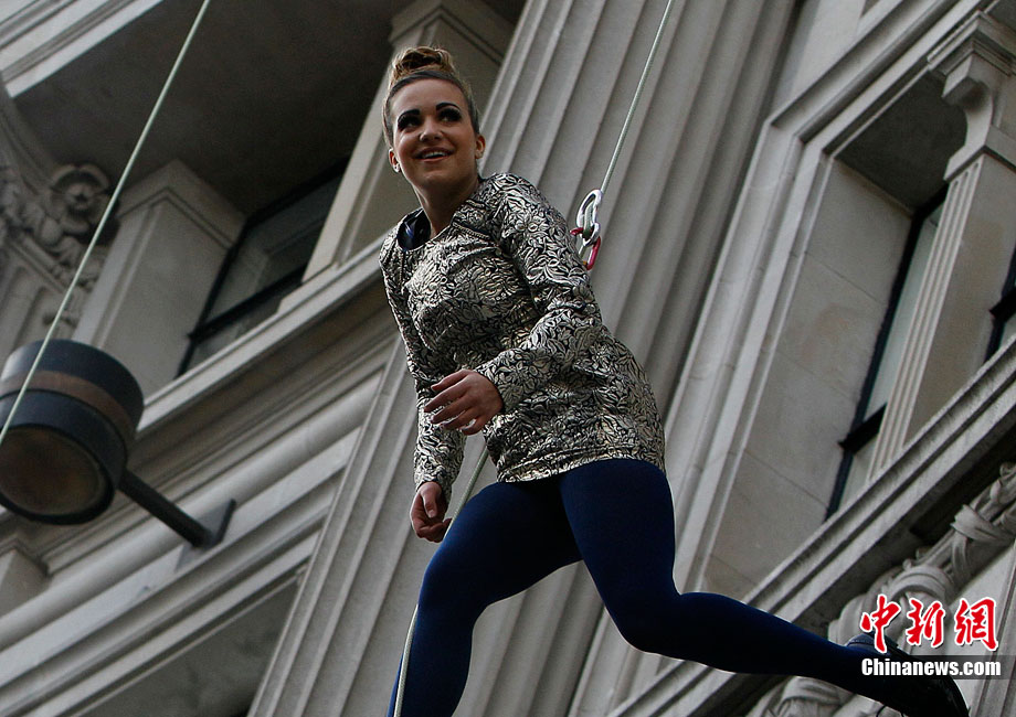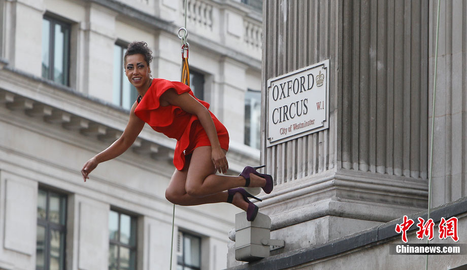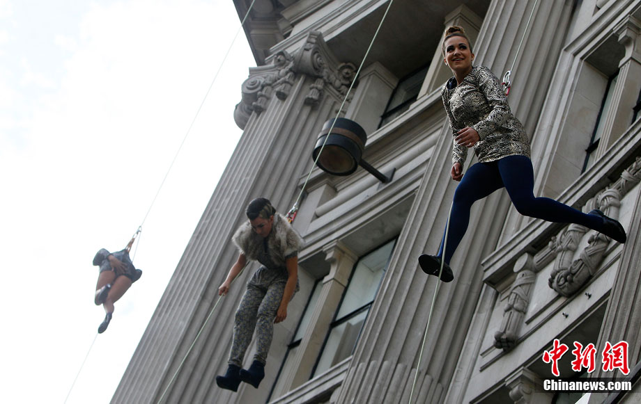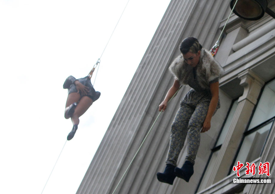 當地時間9月6日,一批模特在英國倫敦掛上鋼絲,在大樓外上演了一場精險刺激的空中時裝秀。這場時裝秀是為了宣傳即將到來的英國時裝周而特別設計的。