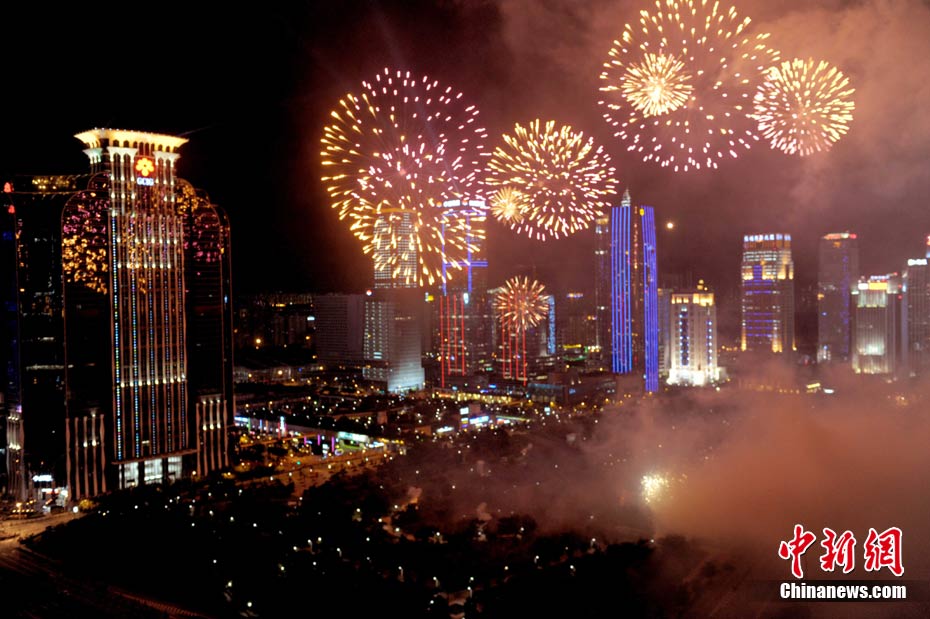 9月6日晚8點30分,深圳夜空璀璨絢麗,慶祝深圳經(jīng)濟特區(qū)建立30周年焰火晚會在深南大道水晶島舉行。今晚燃放煙花數(shù)量145107發(fā),主要品種19種,全長30分鐘,共四個樂章。深圳市民分別在蓮花山公園、市民中心、深南路、彩田路、會展中心等區(qū)域觀看深圳經(jīng)濟特區(qū)30周年慶典煙花晚會。中新社記者 陳文 攝