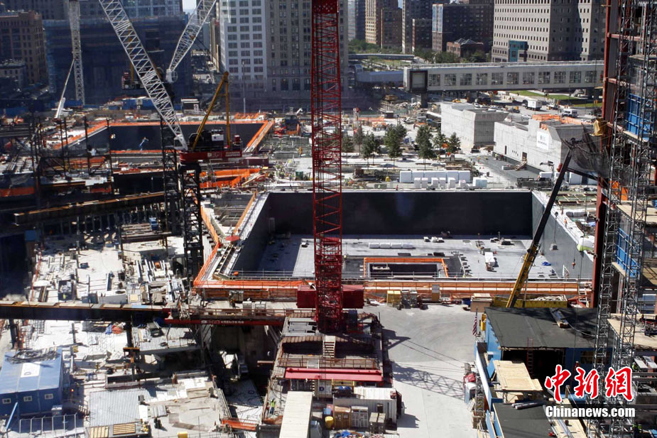 美國當地時間9月7日,記者在紐約世貿建筑工地現場看到,以原先世貿雙子塔樓基座為主體的兩個方形瀑布池業已成型,周圍也種上了些許綠樹。9·11紀念館館長喬·丹尼爾斯表示,肯定將在事件十周年紀念日當天開館。中新社記者 孫宇挺 攝