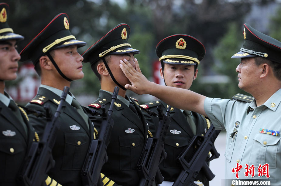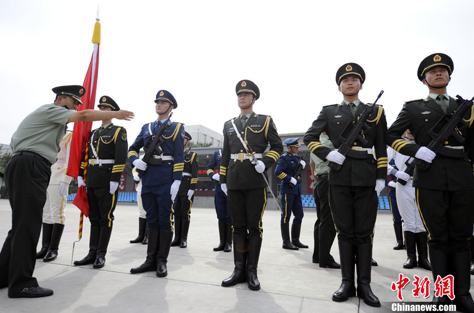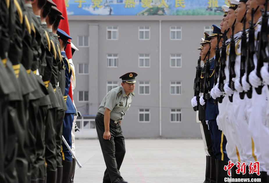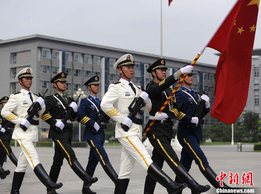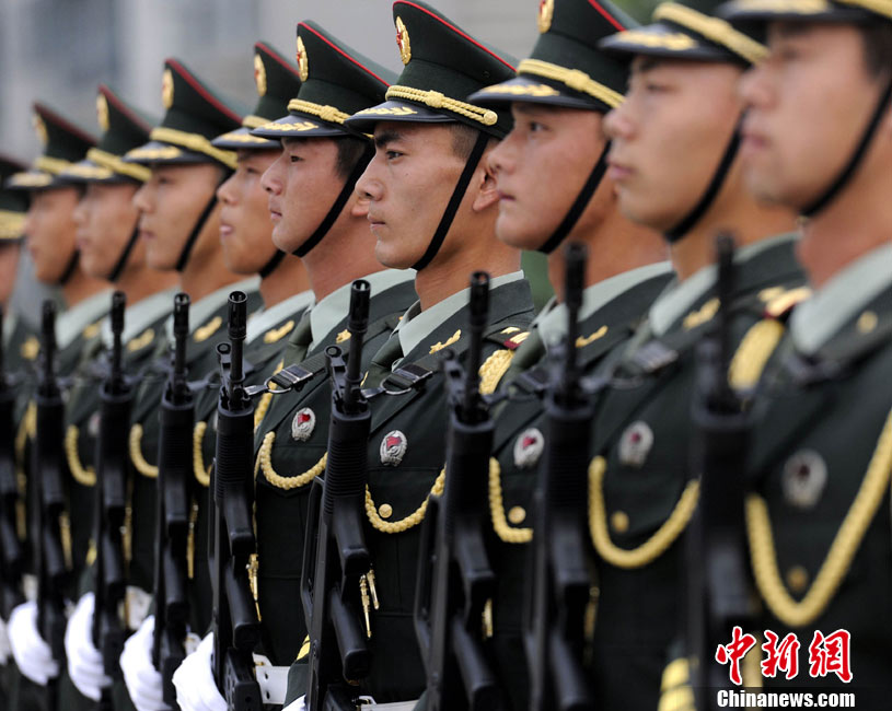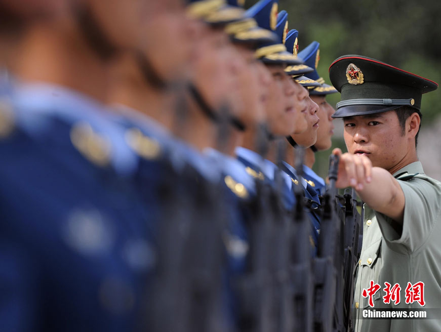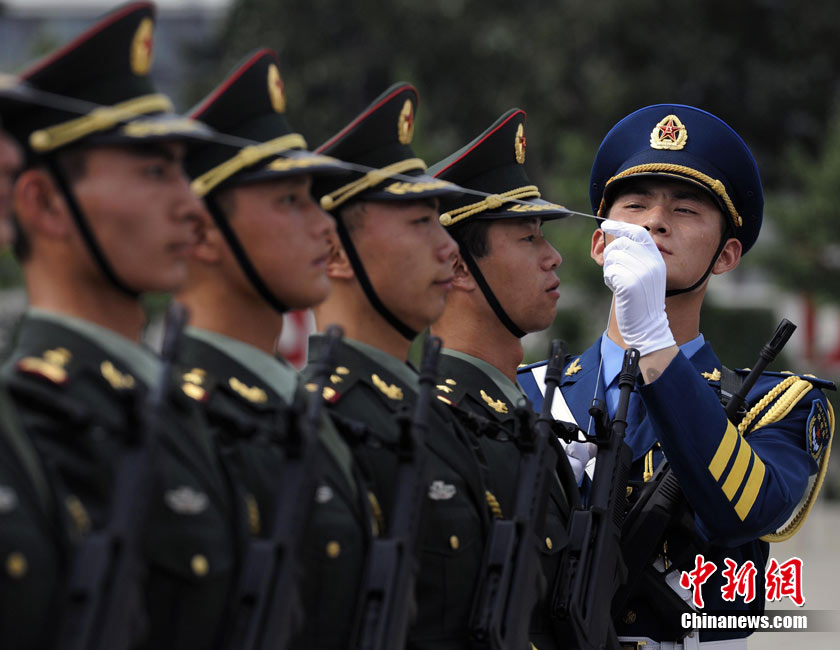 中國國防部9日宣布,應墨西哥國防部邀請,由解放軍北京衛戍區儀仗大隊選派36人組成的中國人民解放軍三軍儀仗方隊,今日從上海啟程赴墨西哥參加墨獨立200周年慶典閱兵。圖為近日中國人民解放軍陸海空三軍儀仗隊戰士在駐地訓練。中新社記者 劉震 攝