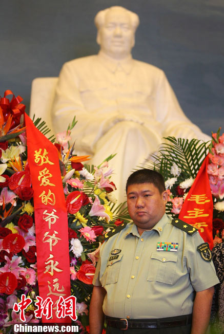 9月9日是毛澤東逝世34周年紀(jì)念日。當(dāng)日上午,毛澤東的孫子、剛剛晉升為解放軍少將的毛新宇與夫人劉濱,帶著兩歲的女兒毛甜懿到位于北京天安門廣場(chǎng)的毛主席紀(jì)念堂敬獻(xiàn)鮮花。中新社記者 任晨鳴 攝