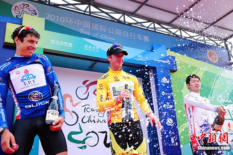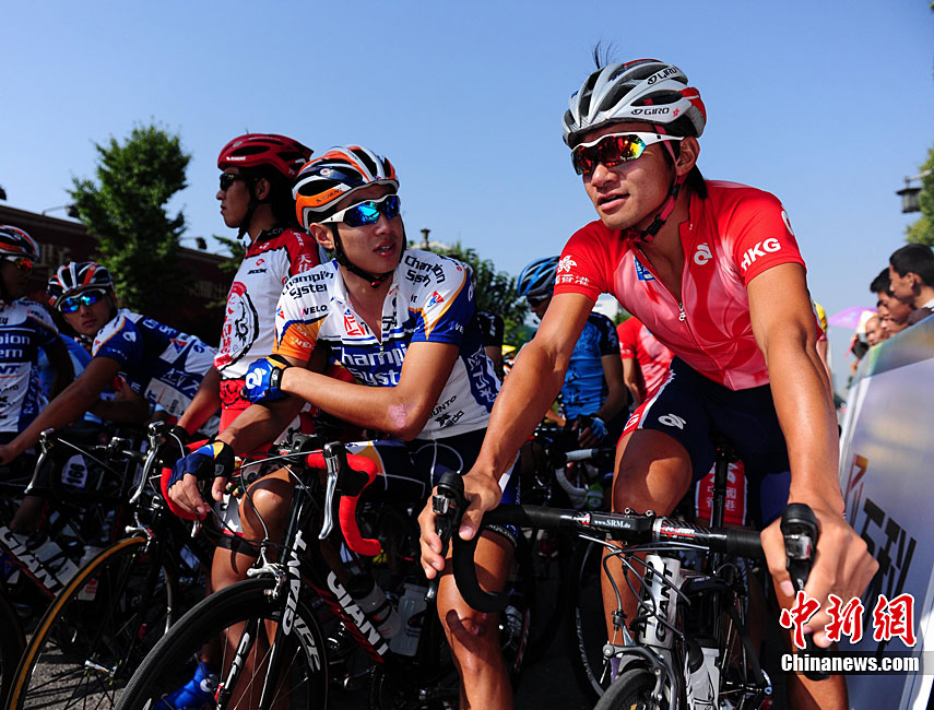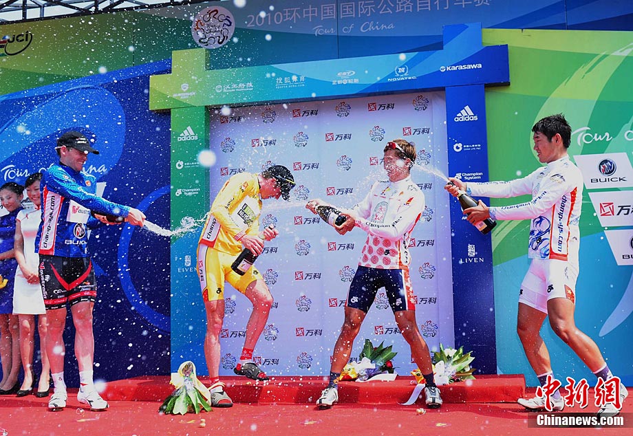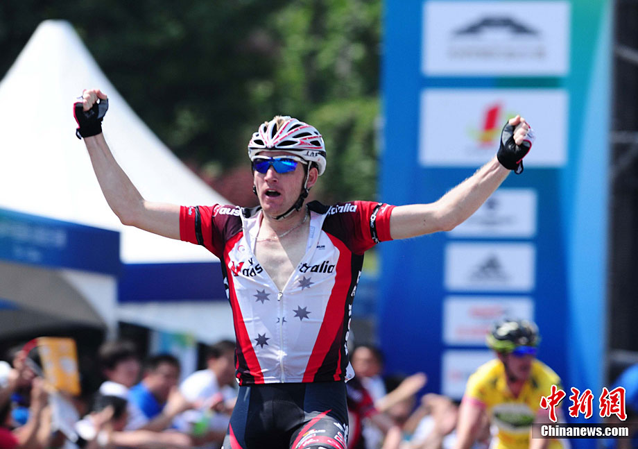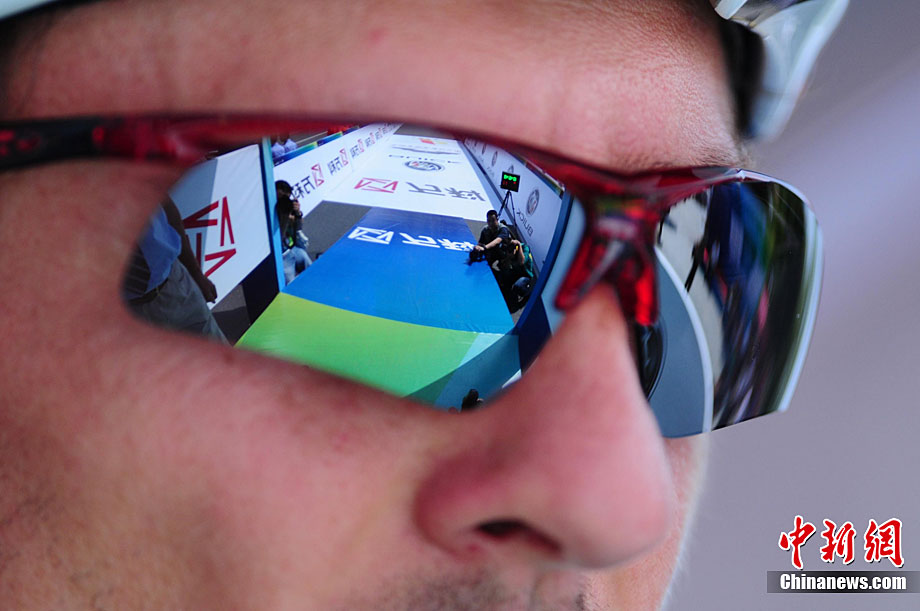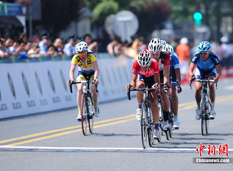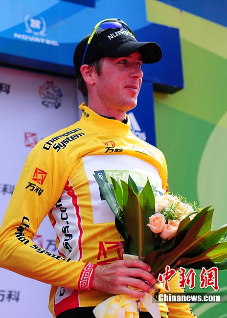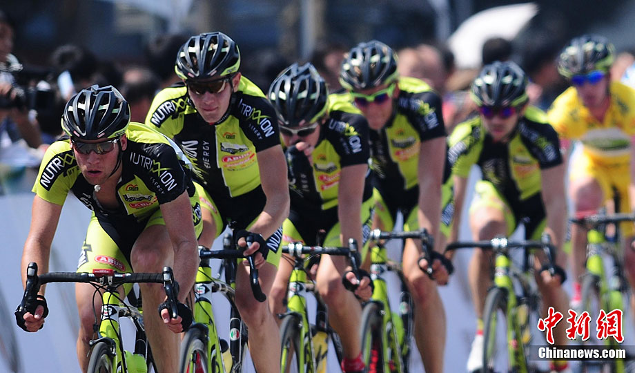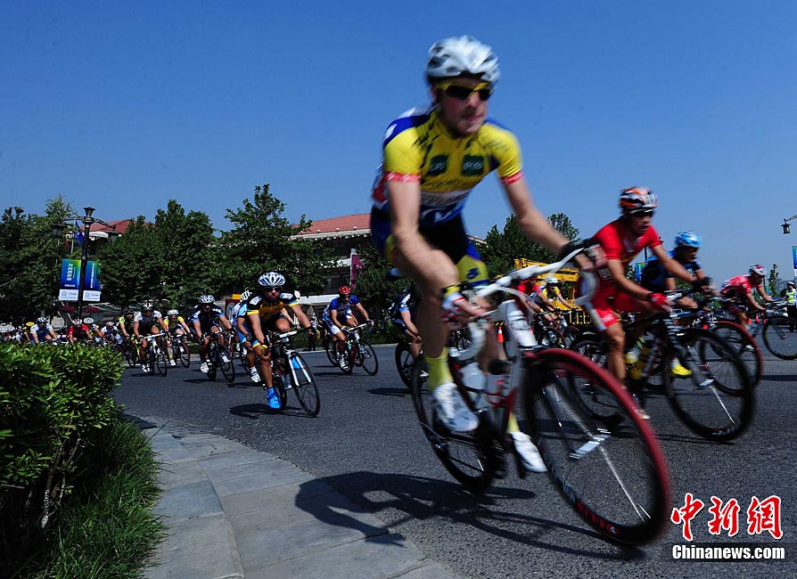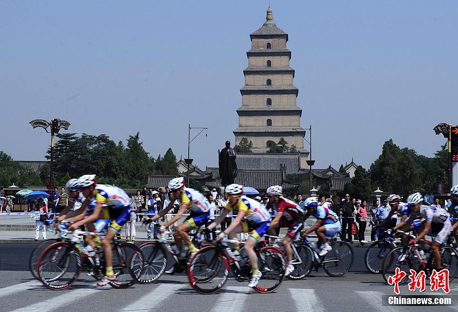 9月10日上午,首屆環(huán)中國國際公路自行車賽序幕賽(個人計時賽)在西安市曲江池畔舉行,結(jié)果德國紐特里什車隊的車手德克·穆勒(中)獲得本賽段冠軍,奪得本次比賽的首件黃色領(lǐng)騎衫。中新社記者 侯宇 攝