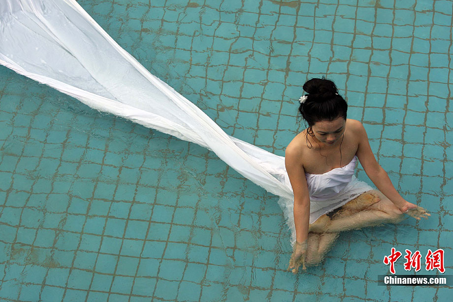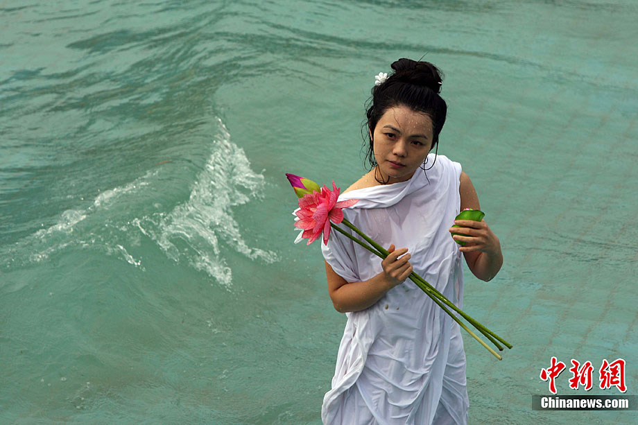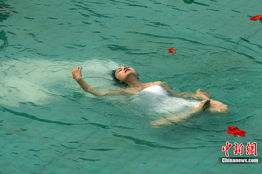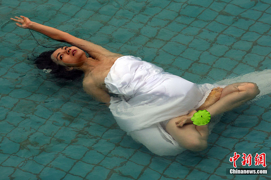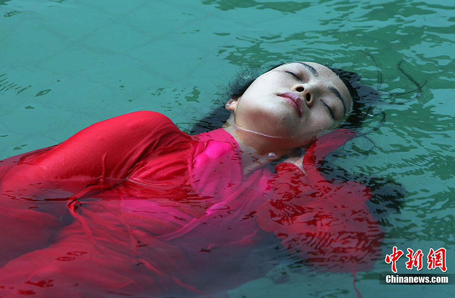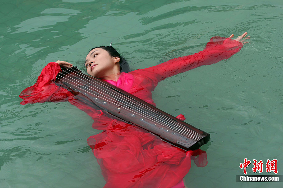 9月11日,漂浮于水上時而禪坐、時而圍繞水中漂浮的古琴緩緩起舞,伴著古琴樂,池水不時變換出各種造型的“水墨畫”,一種前沿新藝術形式在湖北咸寧太乙洞溫泉上演。原創及表演者彭子軒,提出藝術養生的理念,并獨創以子軒內練為基礎的藝術漂浮(包含藝術漂浮舞蹈及藝術漂浮瑜伽),被譽為中國古典花樣游泳。毛建軍 攝