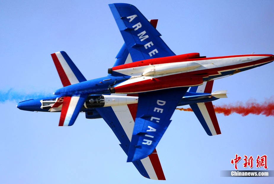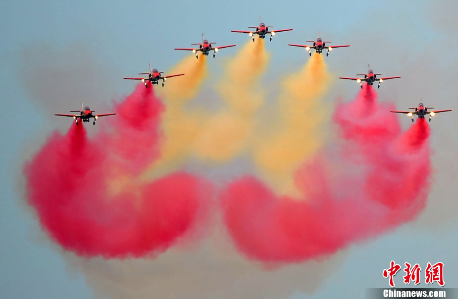 9月12日,為了慶祝意大利“三色箭”特技飛行表演隊成立50周年,多國飛行表演隊“齊聚”意大利,在Rivolto軍事基地進行了精彩的空中特技表演。圖為英國”紅箭“飛行表演隊進行特技表演。