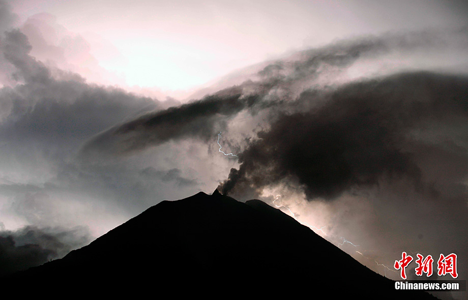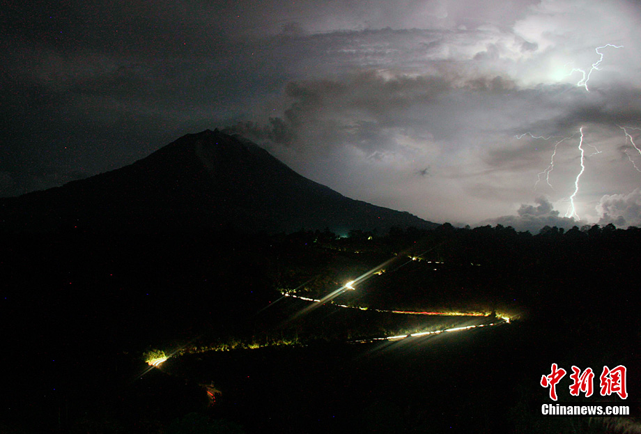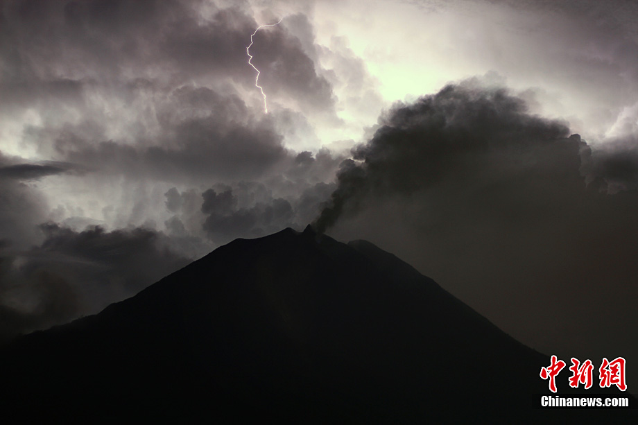 當地時間9月11日,印度尼西亞北蘇門答臘省丹那卡羅,閃電與錫納朋火山噴出的黑煙在空中交匯。