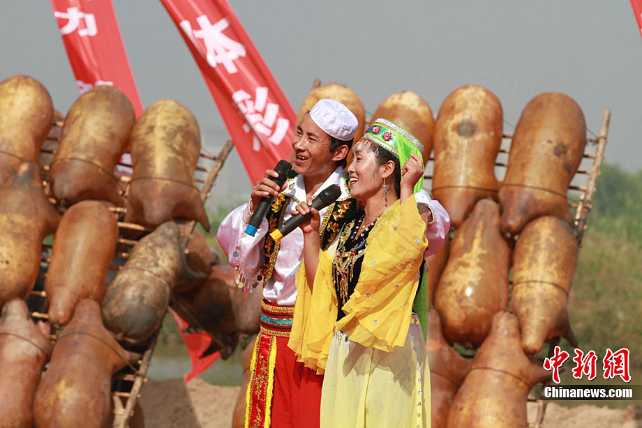 9月13日,蘭州第二屆羊皮筏子黃河漂流活動隆重舉行。羊皮筏子俗稱“排子”,是用山羊割去頭蹄,然后將囫圇脫下的羊皮扎口、吹滿氣而扎成,是一種古老的水運工具,如今已經被淘汰,嬗變成當地一種旅游項目。中新社記者 殷春永 攝
