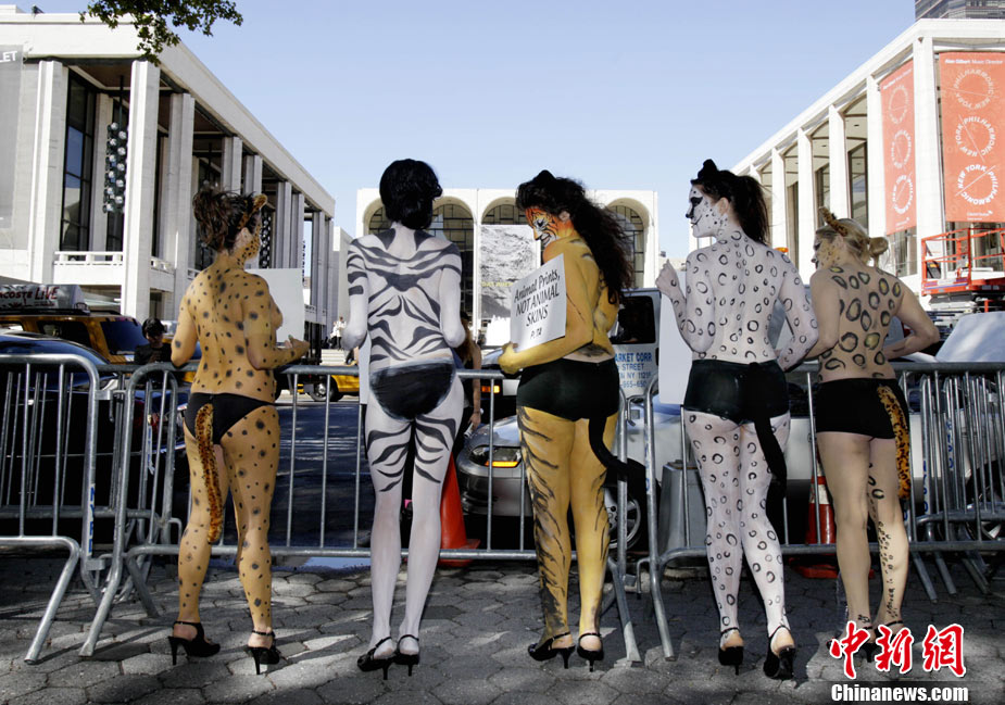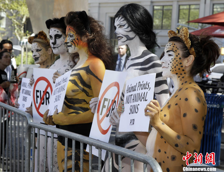 9月14日,在紐約時裝周進行期間,幾位環保愛好者在身上涂畫“動物彩繪”,呼吁保護動物,愛護環境。