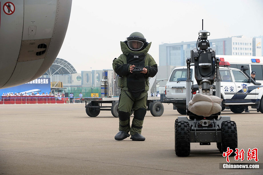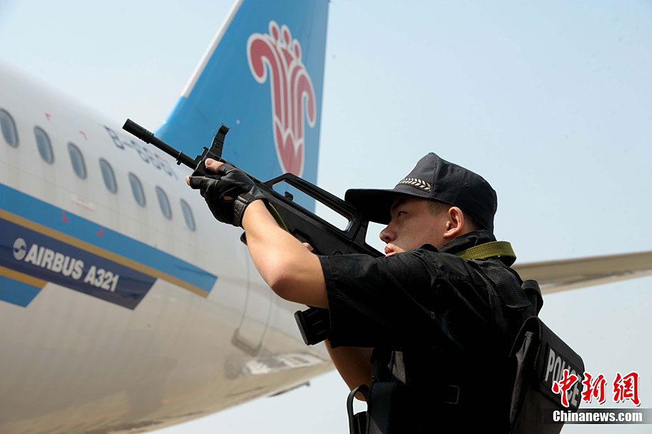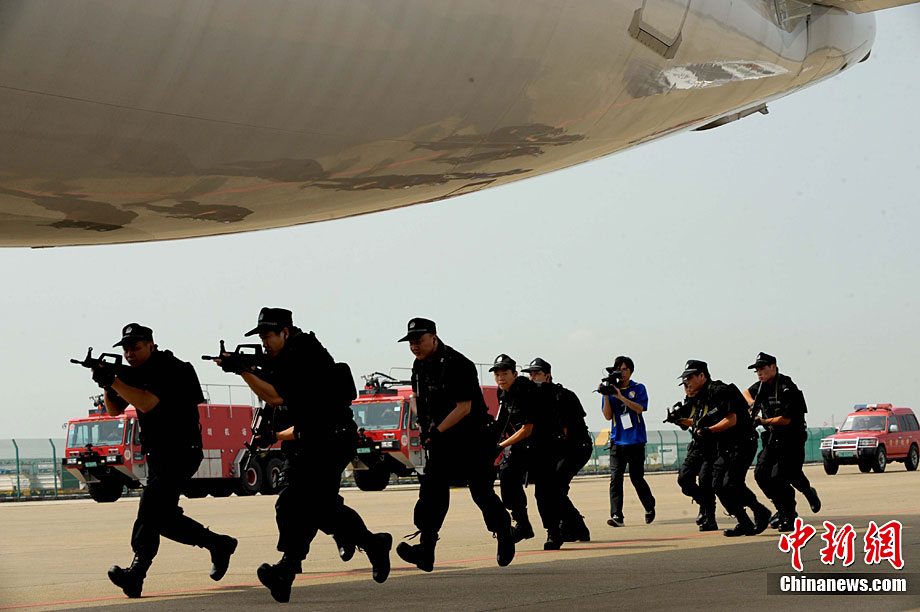 9月16日,深圳寶安國際機場舉行反恐應急演習,模擬一架客機被歹徒劫持后,特警、防爆、消防、醫療救護等各方面展開營救,在短時間內解救人質處理事故。中新社記者 陳文 攝