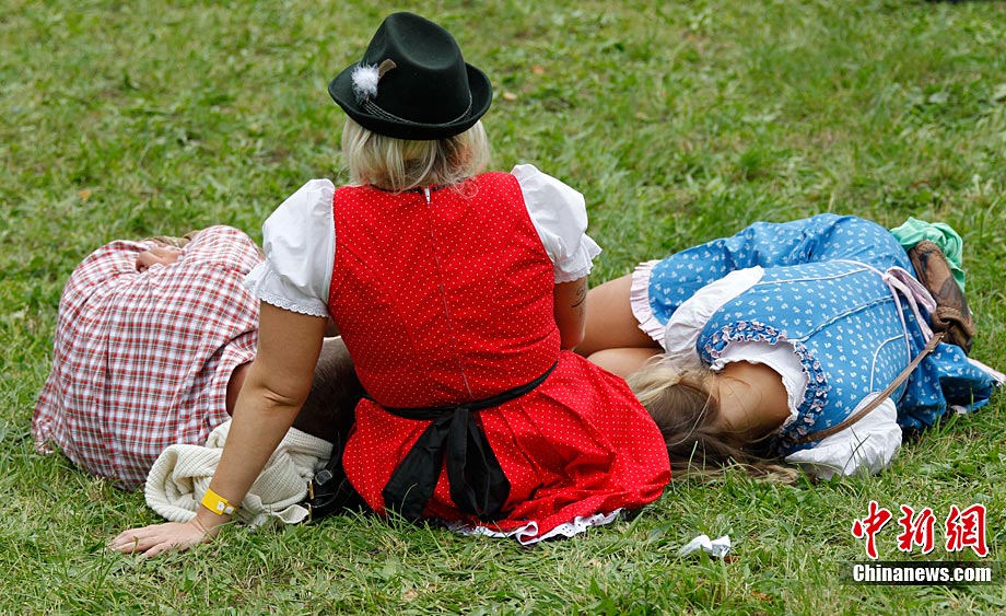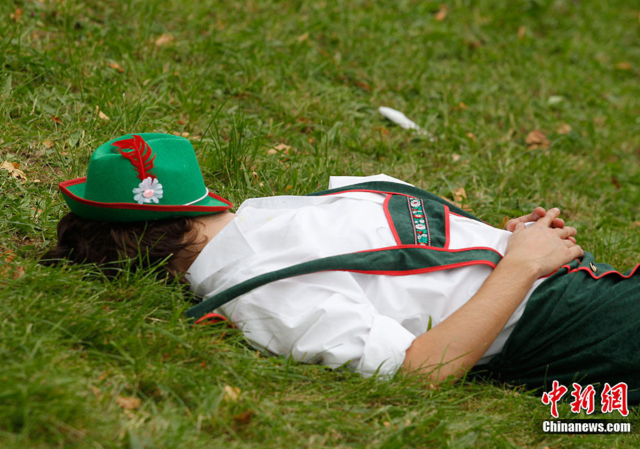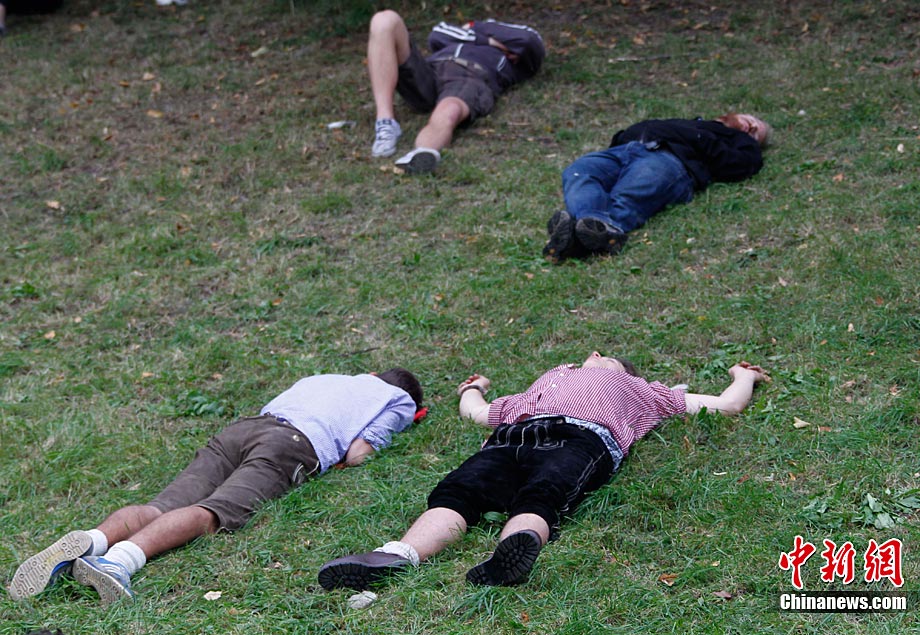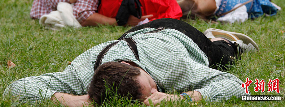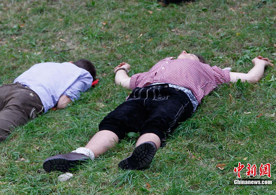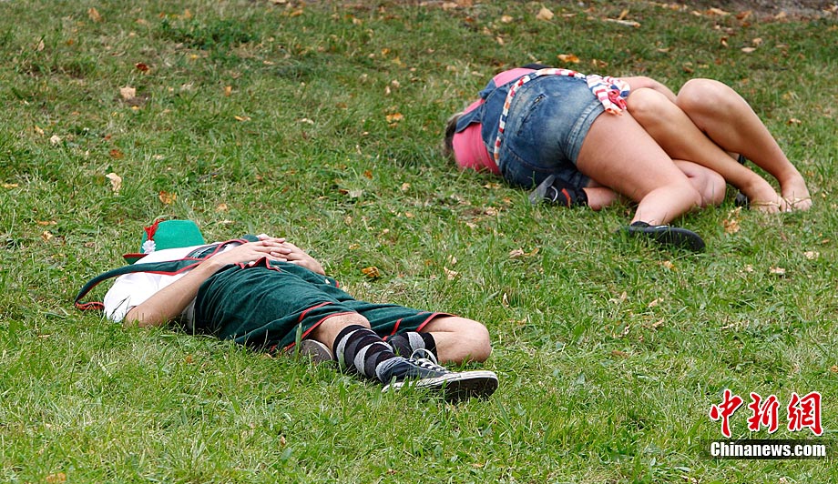 當(dāng)?shù)貢r(shí)間9月18日,慕尼黑啤酒節(jié)上游客喝醉后躺在草坪上酣睡。第177屆德國慕尼黑啤酒節(jié)當(dāng)日正式開幕,迎來了200周歲生日。