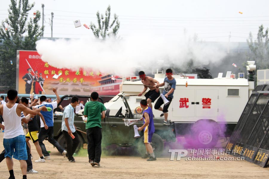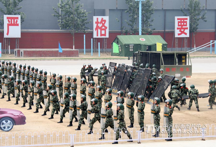 訓(xùn)練場內(nèi),面對各種突發(fā)情況,官兵手持盾牌、警棍,排成各種陣型,疾進(jìn)如風(fēng),徐推如林……