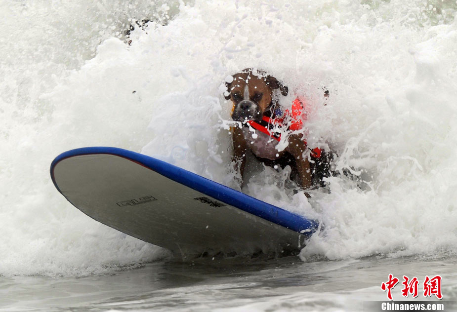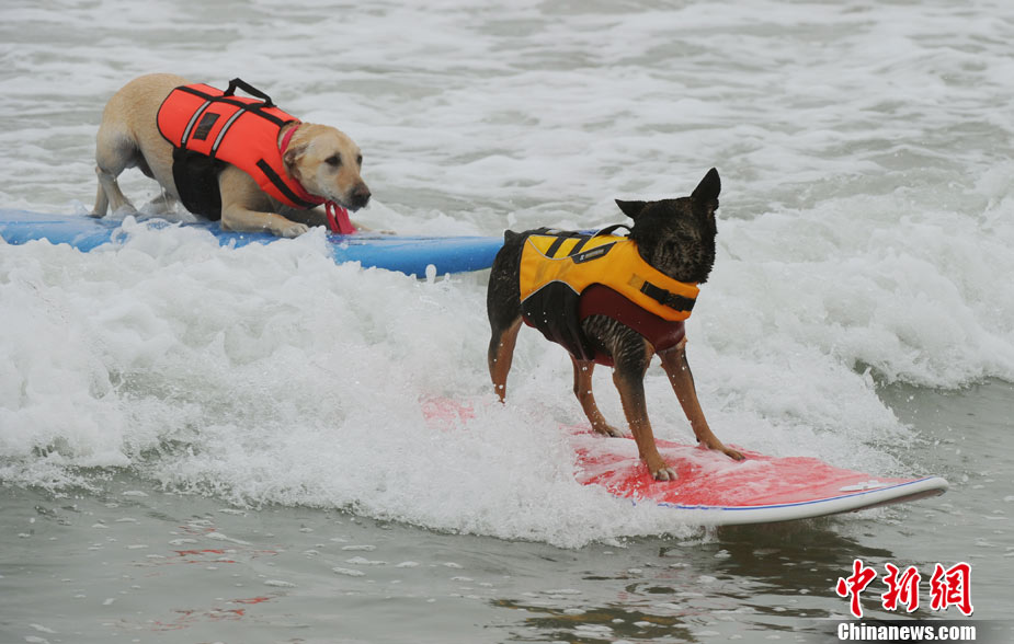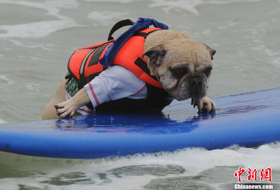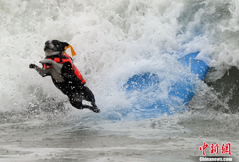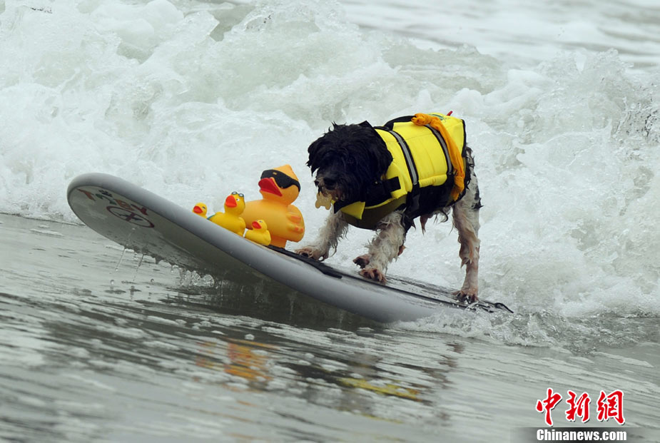9月19日,在美國加利福尼亞州的亨廷頓比奇,可愛的狗狗們舉行了一場別開生面的沖浪大賽。