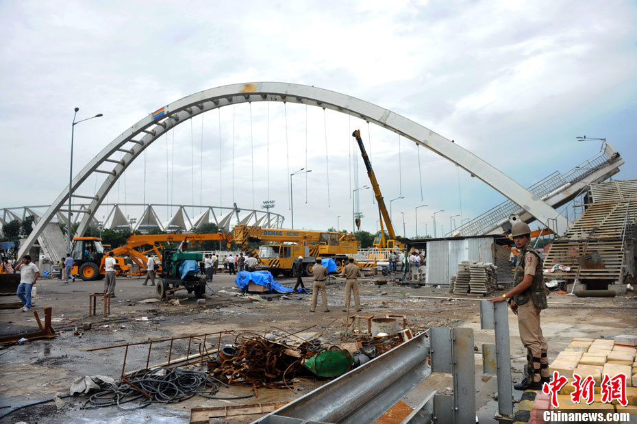 9月21日,印度首都新德里一座正在建造中的過街天橋下午突然坍塌,造成至少26名施工工人受傷,其中5人傷勢嚴重。 印度安全人員和施工工人聚集在倒塌的天橋旁查看情況。