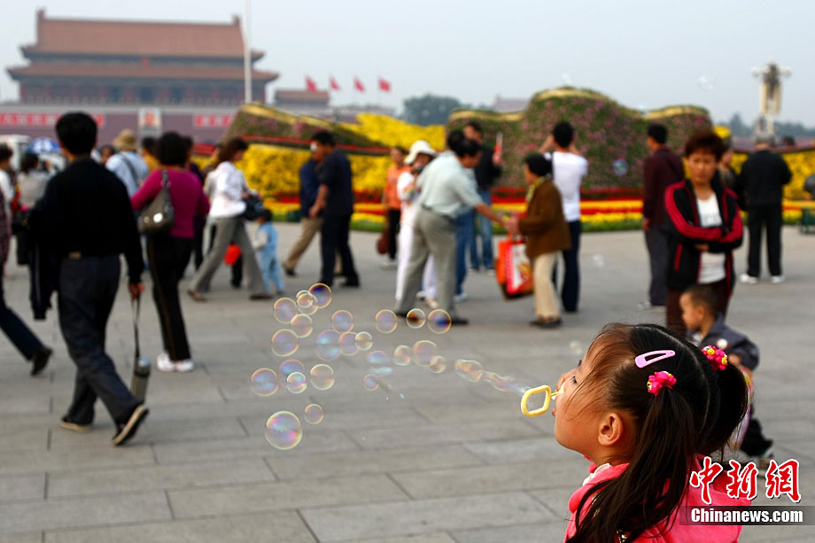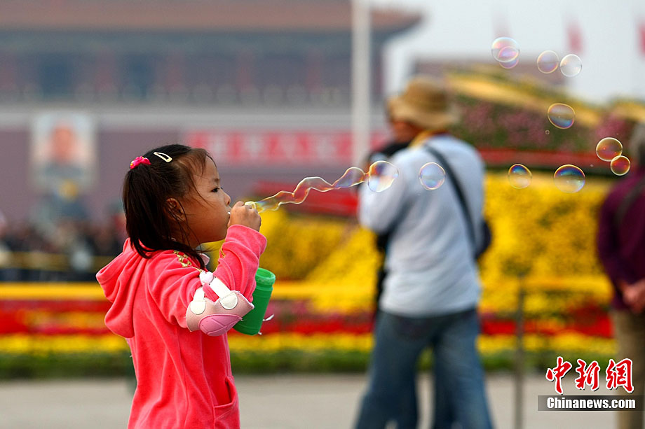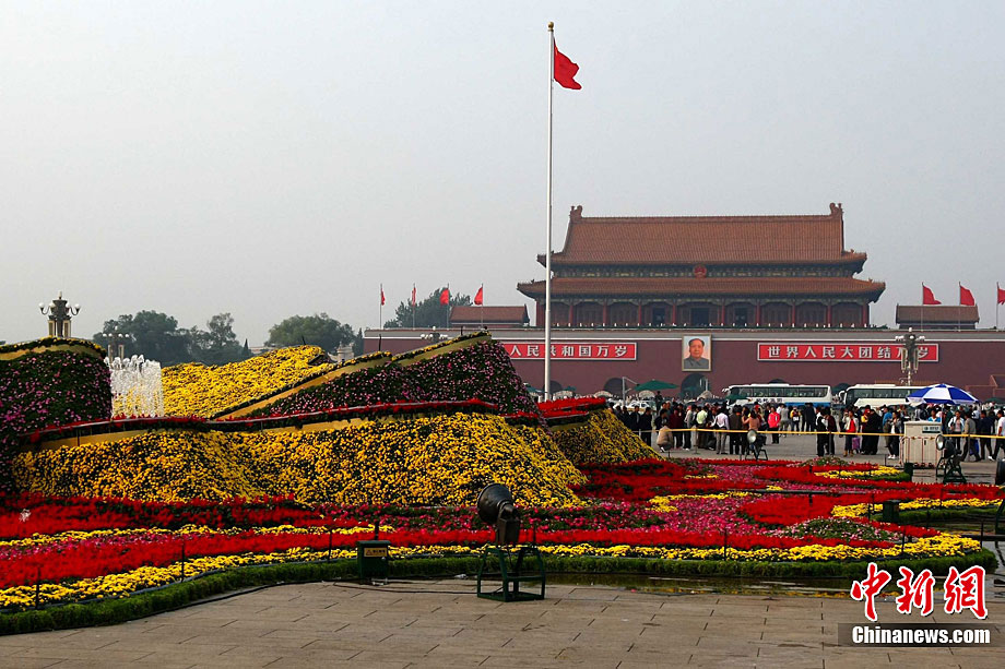 9月25日上午,北京市園林綠化局宣傳中心對外宣布,為了迎接建國61周年,天安門廣場主題為“花開盛世”的中心水法花壇已經安裝完畢并正式亮相。吳間道 攝 圖片來源:cnsphoto