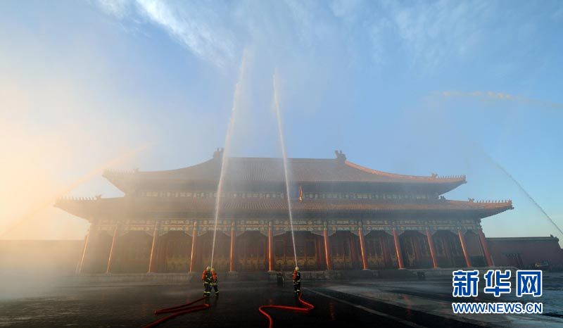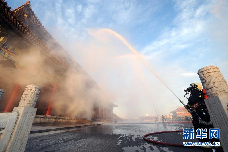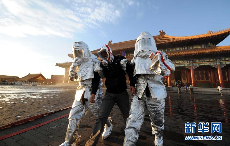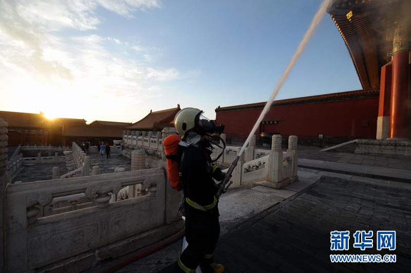 9月27日,北京消防部門在北京故宮太和殿舉行消防演習。北京消防部門開展多種形式的滅火救援演練,并加大演練的頻次和力度,保障今年“十一”長假期間的消防安全。李文 攝 圖片來源:新華網