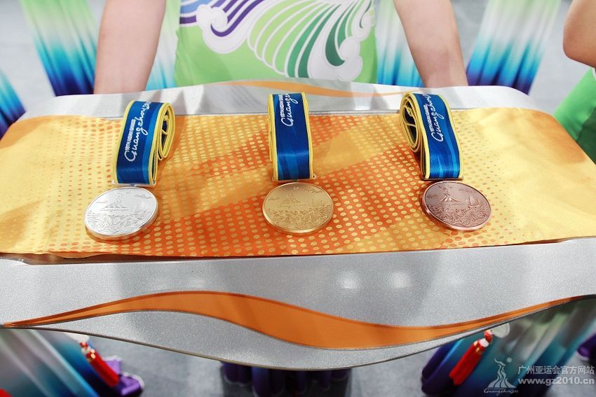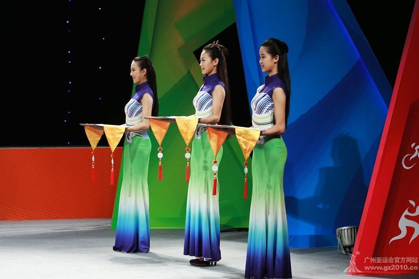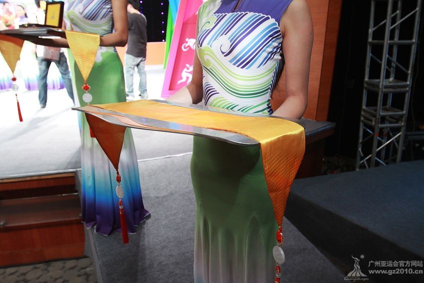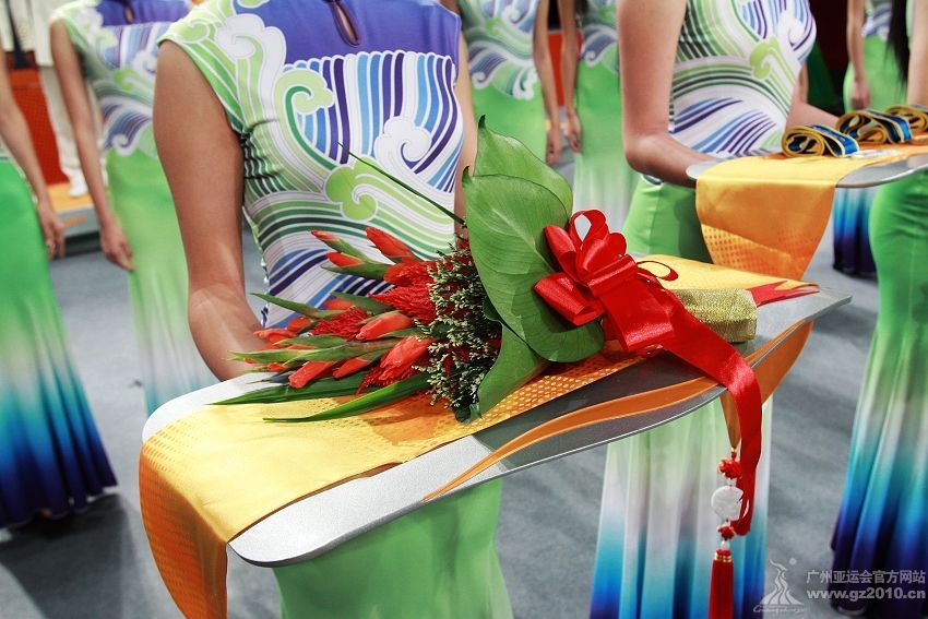9月29日下午,第16屆亞運會頒獎儀式系列物資發布儀式在廣州市二少年宮舉行。圖為頒獎禮儀。圖片來源:廣州亞運會官網