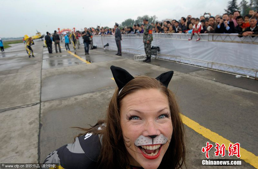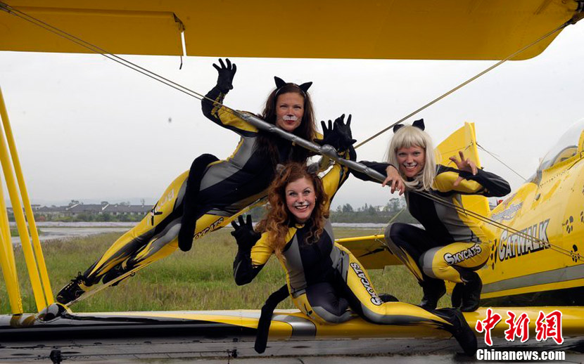 2010年9月30日,2010年首屆中國(重慶)國際飛行愛好者年會暨國際通用航空器展示交易會在重慶梁平縣開幕。雖本場航空表演僅對專業人士開放,仍然吸引了3萬人涌進梁平機場。圖為瑞典貓女郎準備進行“機翼行走”特技表演。圖片來源:CFP視覺中國