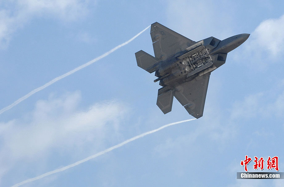 當地時間10月3日,美國著名的密拉瑪航空展在加州密拉瑪海軍陸戰隊航空基地舉行。三天的航空展示和飛行表演吸引了近70萬人次參觀。圖為美軍最先進的F-22猛禽戰機空中英姿。中新社發 張煒 攝