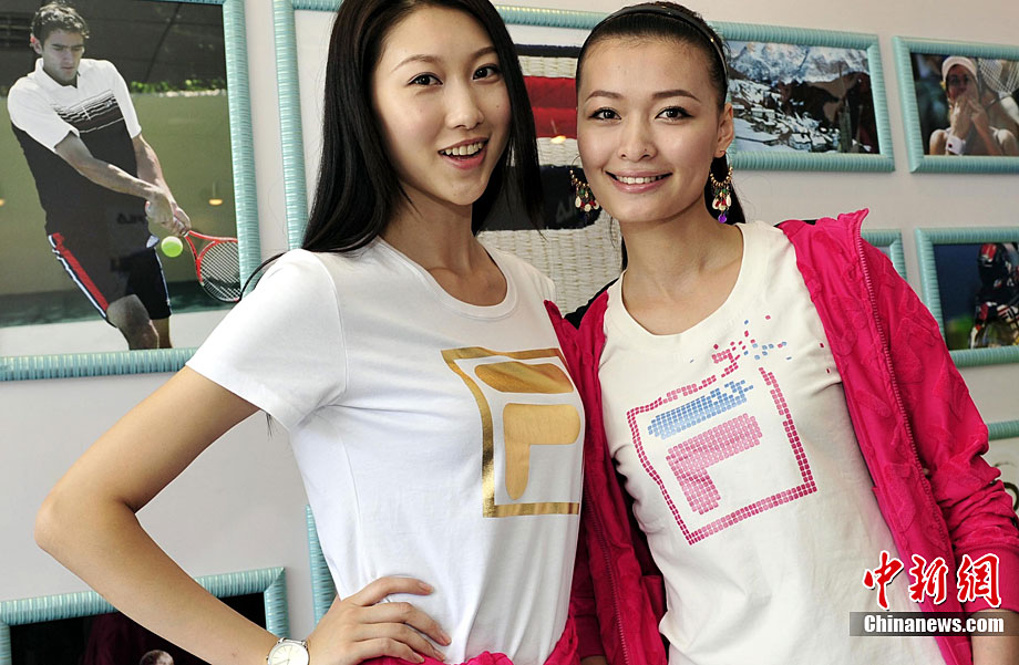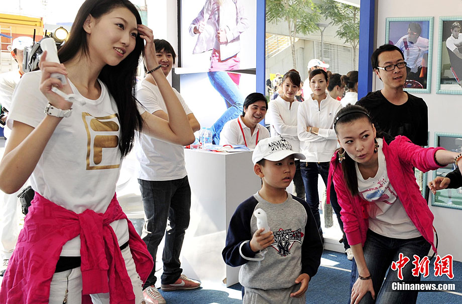 10月4日,時尚中網代言人、第五屆中國職業模特大賽冠軍趙晨池,首屆亞洲超級模特大賽冠軍王慧在北京亮相時尚運動品牌FILA展臺,與現場的球迷朋友們開展了一場別開生面的網球游戲體驗活動,助陣FILA及參與本屆中網的FILA四位代言人。中新社記者 錢興強 攝