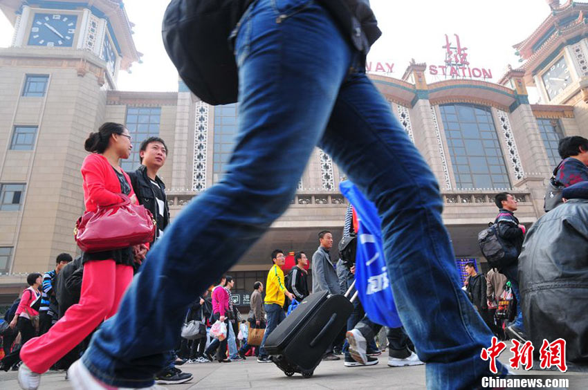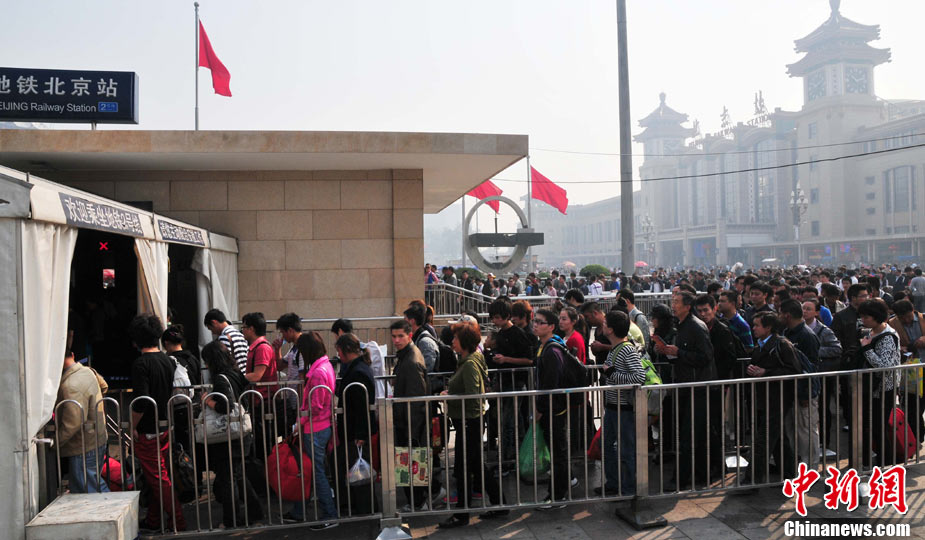 2010年10月6日,國慶“十一”黃金周長假即將結束,北京站、北京西站迎來返程客流高峰。樊甲山 攝 圖片來源:CFP視覺中國