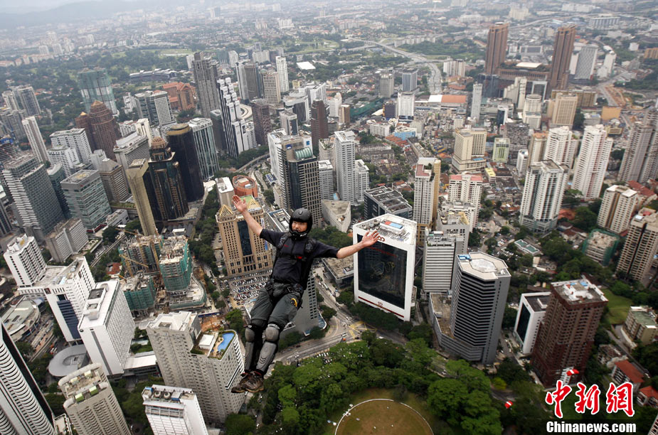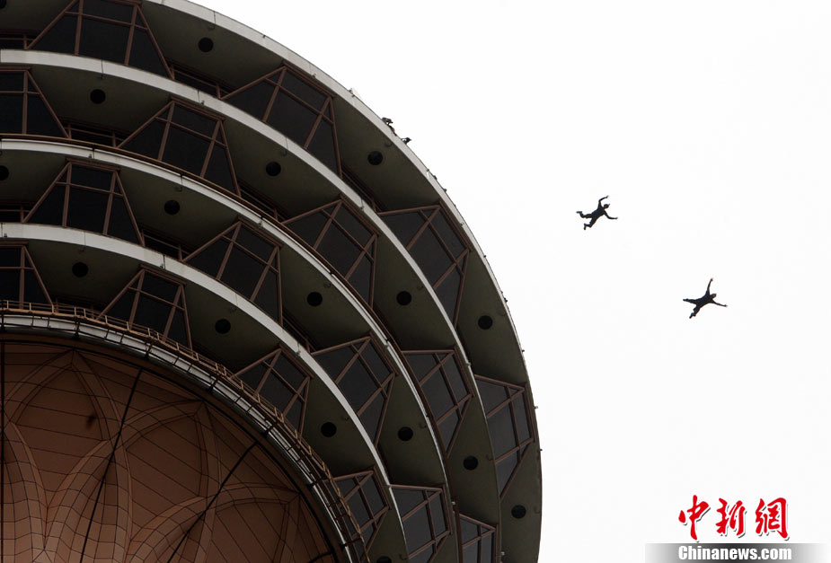 10月7日,幾位極限高手在馬來西亞吉隆坡的雙子高塔上大玩跳躍,體驗超乎尋常的刺激感受。