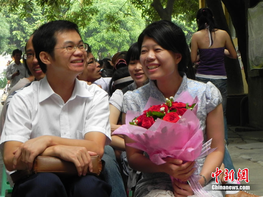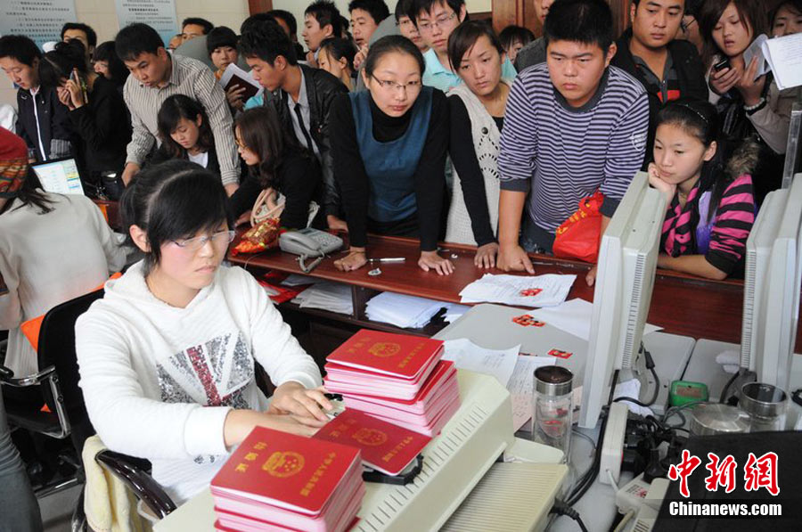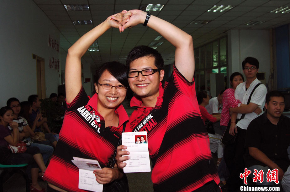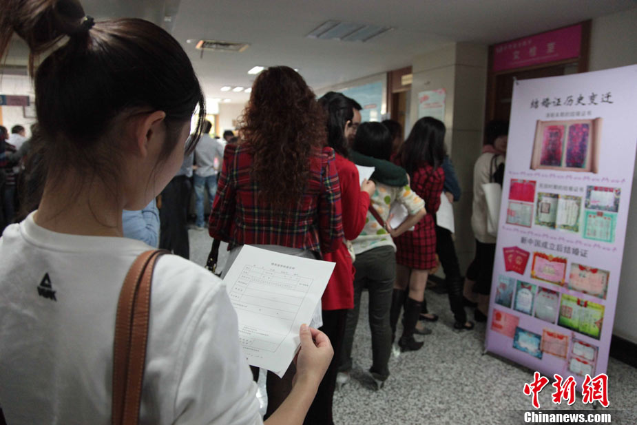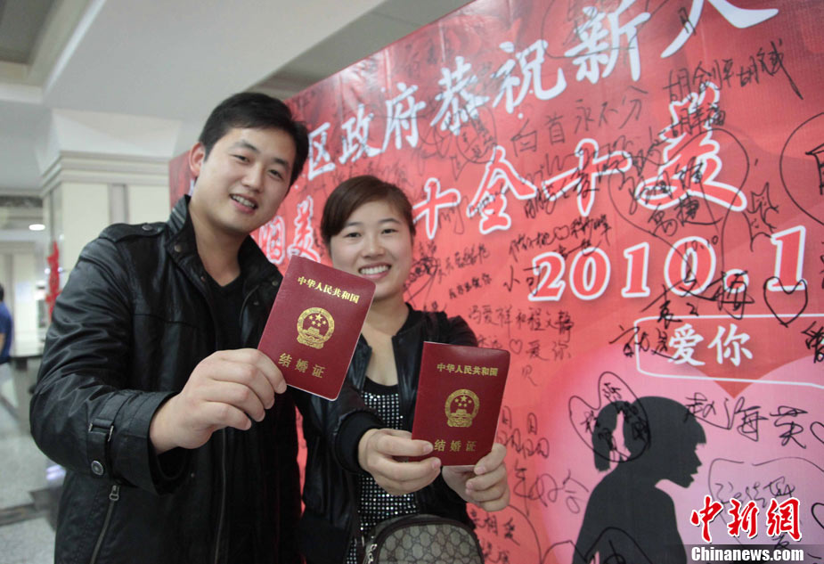 2010年10月10日,全國各地新人辦理結(jié)婚登記。很多新人選擇被寓意“十全十美”的好日子領(lǐng)結(jié)婚證。圖為鄭州出現(xiàn)結(jié)婚登記高峰,導(dǎo)致各區(qū)民政局婚姻登記處門前都排起長長的隊伍。一對新人在長長的隊伍中手挽手排除等候。沙浪 攝 圖片來源:CFP視覺中國