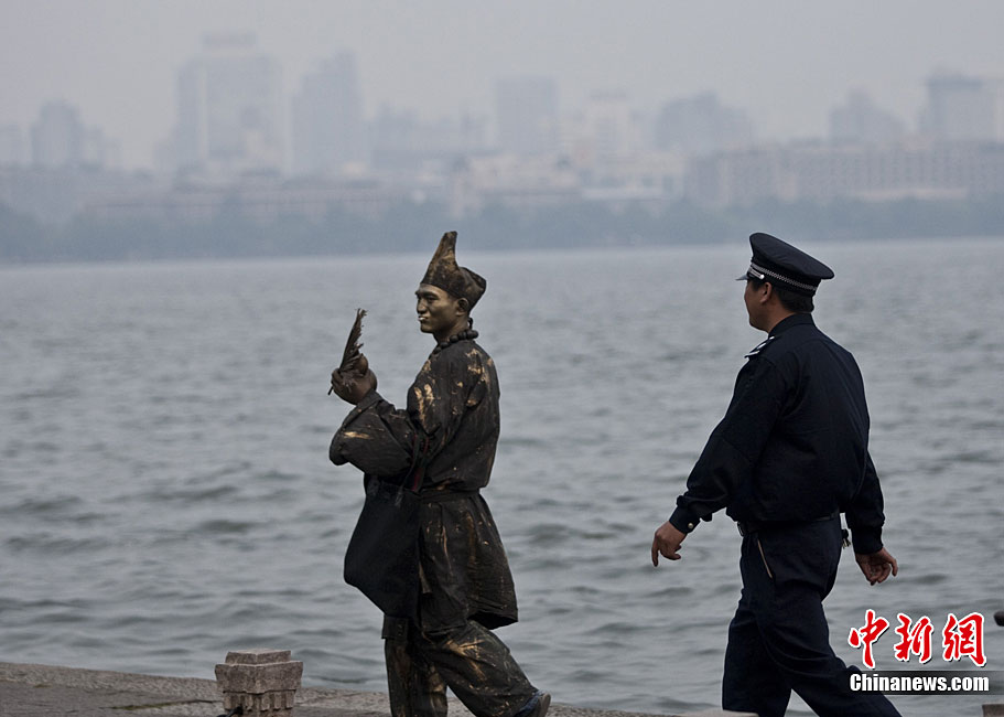 2010年10月上旬,一名打扮成濟公模樣的人在浙江省杭州市西湖白堤和游客合影,“濟公”身上涂滿了銅顏色的彩繪,看上去像雕塑一樣。據悉,這位20多歲“濟公”來自江蘇,從今年春天開始扮成“濟公”,在全國游走。和他合影需要交5元錢。許康平 攝 圖片來源:cnsphoto
