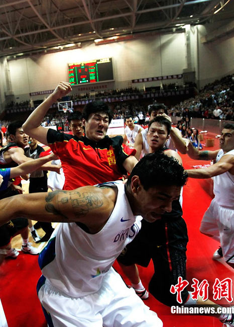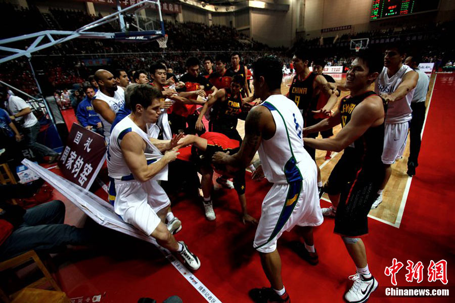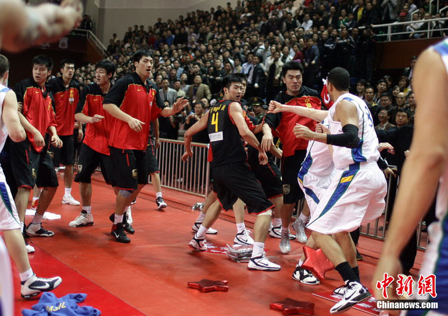 10月12日,河南許昌,2010男籃亞運熱身賽第3場,中國Vs巴西。雙方發生摩擦,爆發群毆。圖片來源:CFP視覺中國