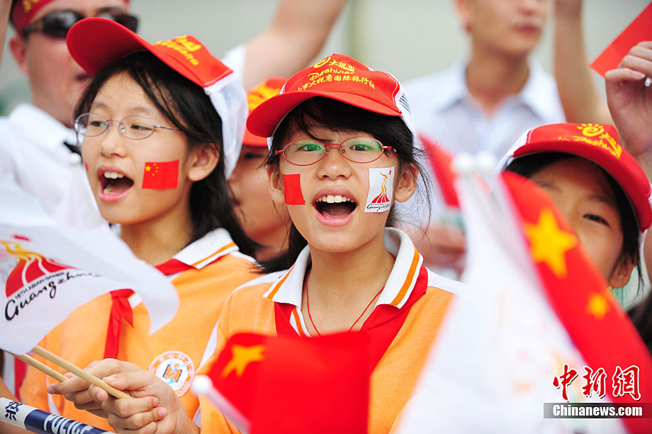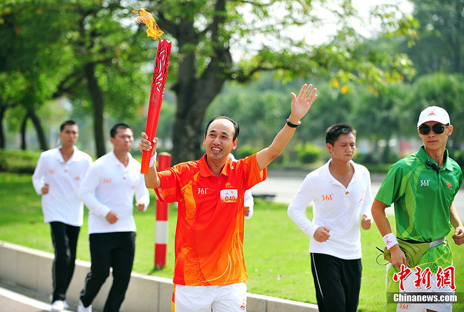 10月13日,備受矚目的第16屆廣州亞運會火炬?zhèn)鬟f在廣東省中山市舉行;鹁?zhèn)鬟f從孫文紀念公園出發(fā),火炬手有科學家、音樂家、漫畫家、美術家、企業(yè)家等80名火炬手接力,全長11.2公里。中新社記者 陳文 攝