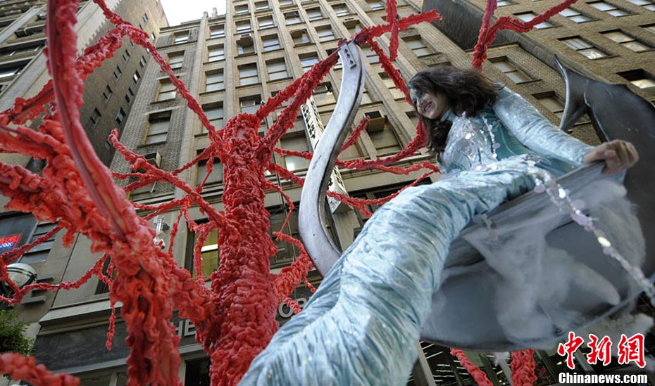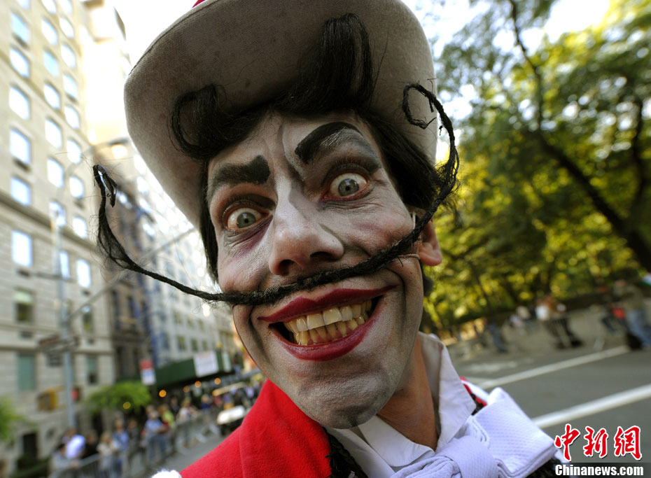 來自意大利劇木偶奇遇記的劇成員在紐約曼哈頓第五大道進行街頭表演。