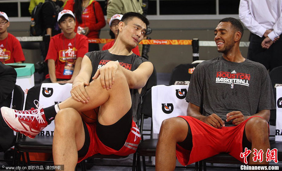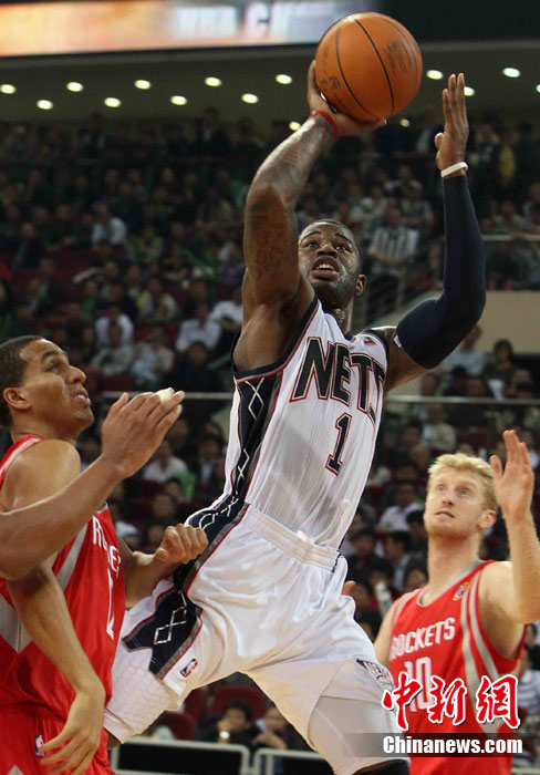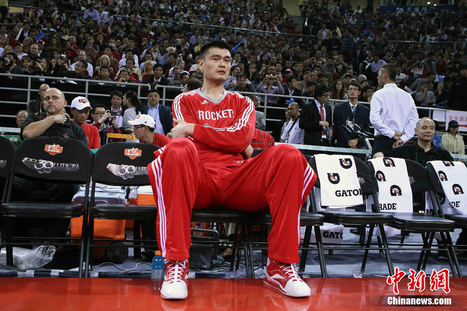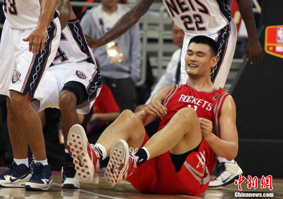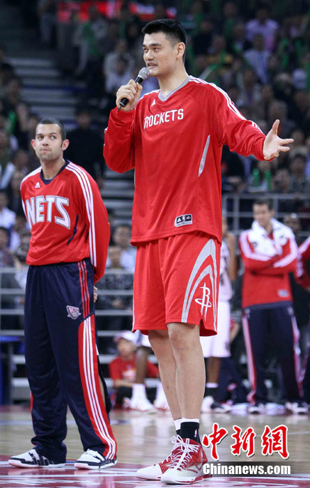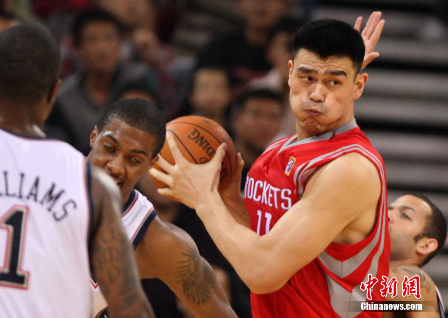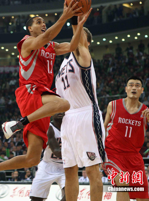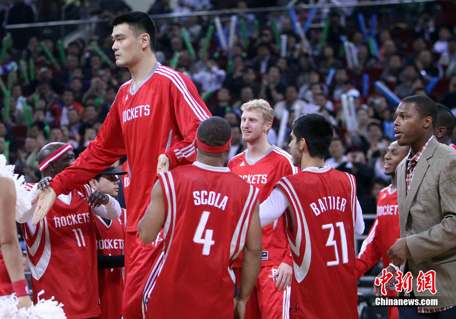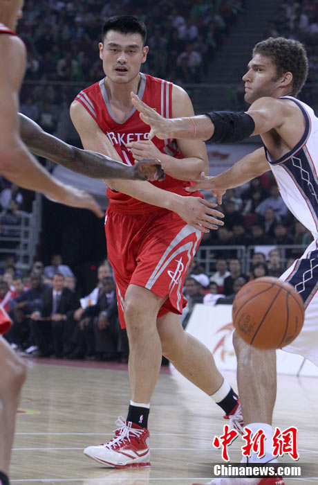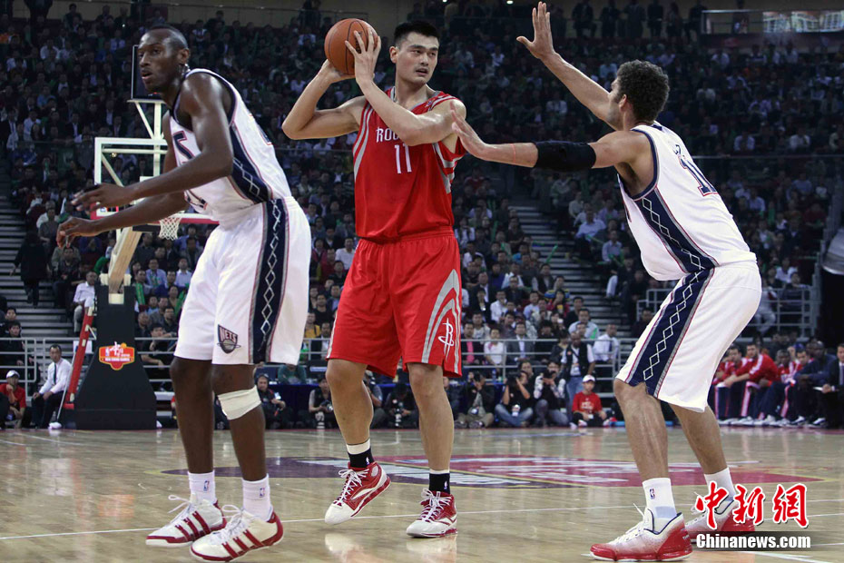 10月13日晚,2010年NBA中國賽首場比賽在北京奧運會的籃球館——五棵松體育館舉行,姚明領(lǐng)銜的休斯頓火箭隊最終以91比81戰(zhàn)勝新澤西網(wǎng)隊。中新社記者 任晨鳴 攝