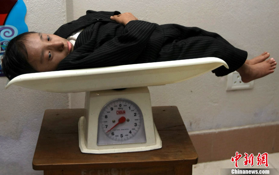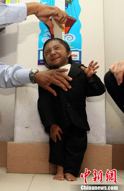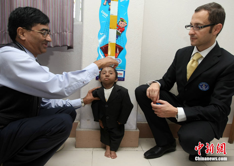 10月14日,在尼泊爾中部小城博克拉,一名尼泊爾醫生在《吉尼斯世界紀錄大全》工作人員的見證下為18歲的卡根德拉·塔帕·馬加爾測量身高。馬加爾出生于1992年10月14日,現在身高65.53厘米,體重5.45公斤。今天,馬加爾成年,從而打破全球成人最矮身高紀錄。