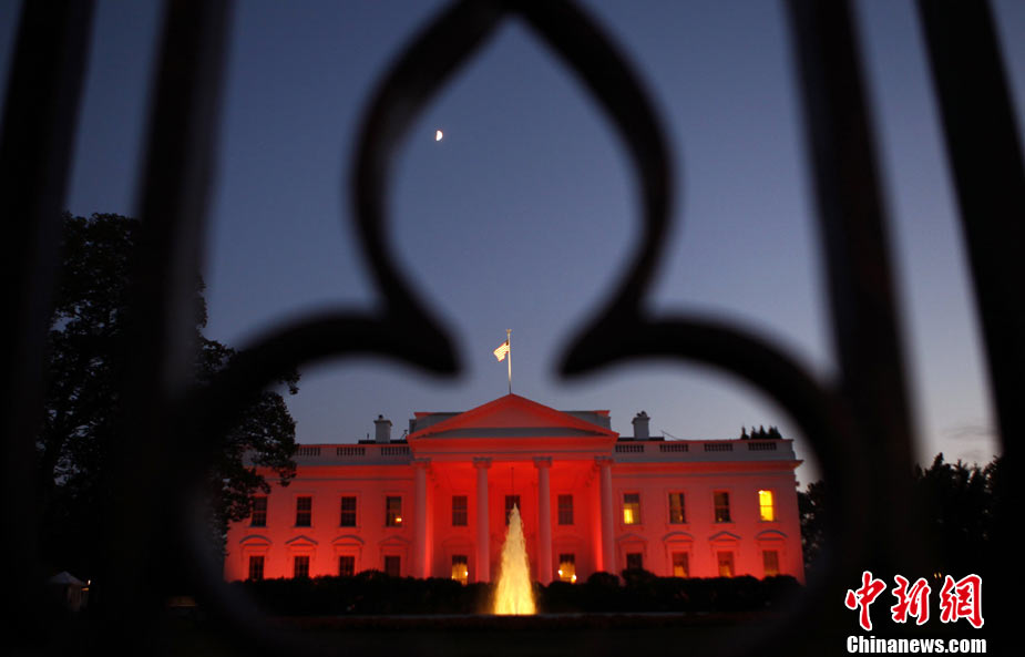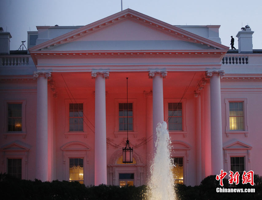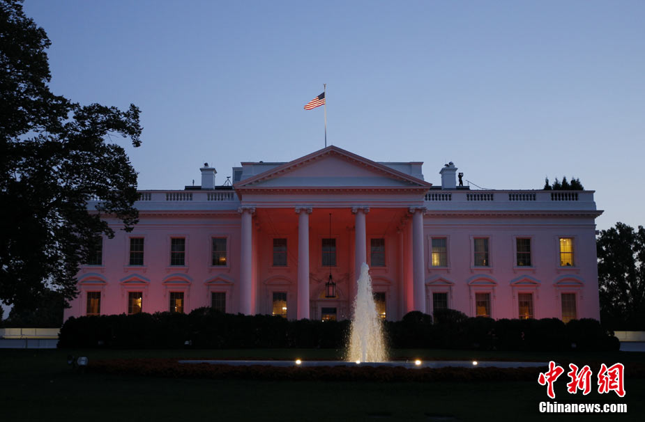 10月14日,美國華盛頓,白宮沐浴在粉紅色燈光中,以支持乳腺癌宣傳月活動。每年的10月是乳腺癌防治月。