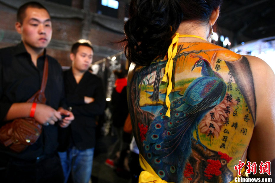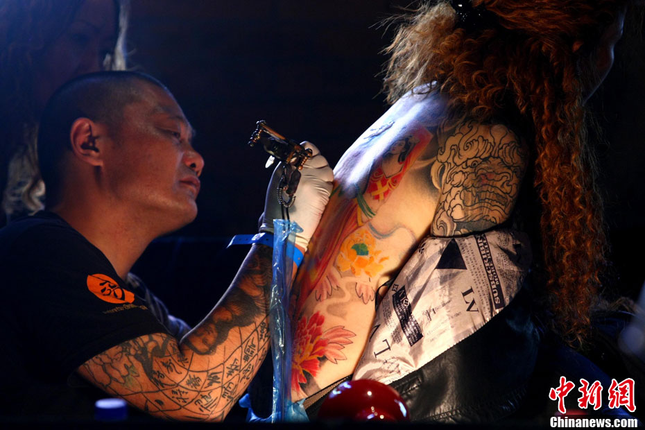 10月15日,中國(國際)紋身藝術節(jié)在北京798藝術區(qū)開幕,這是國內(nèi)舉辦的首次國際性紋身藝術節(jié)。本屆紋身展會的宗旨是:“讓藝術向紋身靠攏”,為國內(nèi)外紋身師提供一個公平、公正的同臺獻藝和交流的平臺。來自美國、澳大利亞、新西蘭等國以及中國許多省市的紋身師現(xiàn)場展示富有個性、創(chuàng)意十足的紋身作品。藝術節(jié)將持續(xù)至17日。 中新社發(fā) 富田 攝