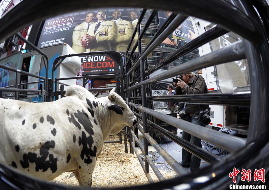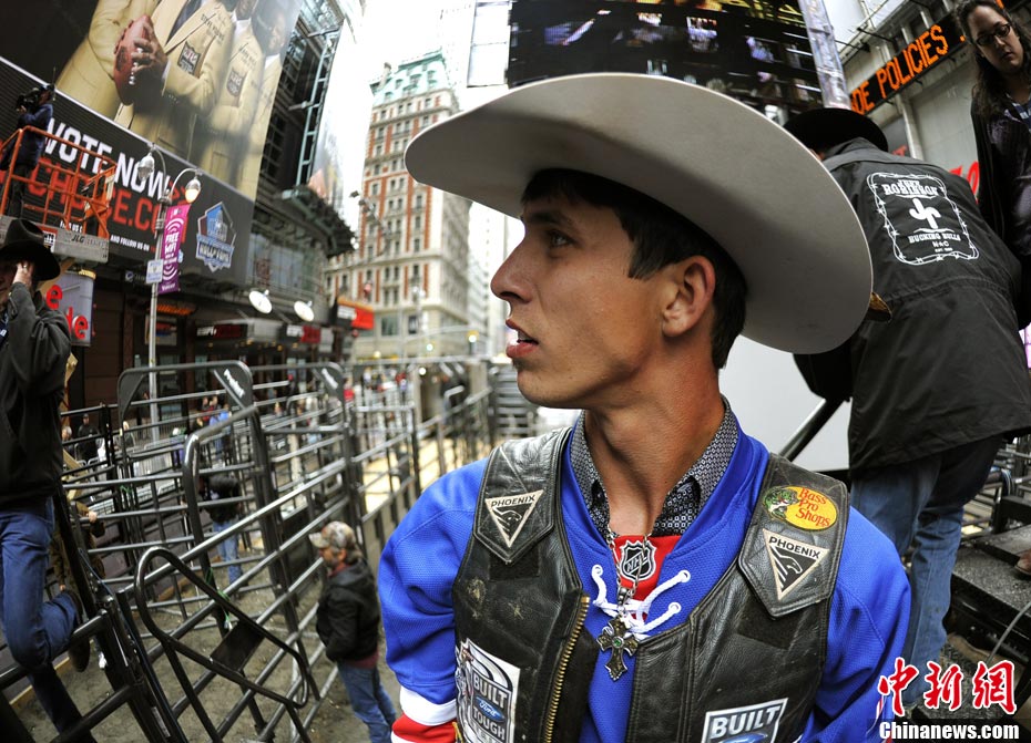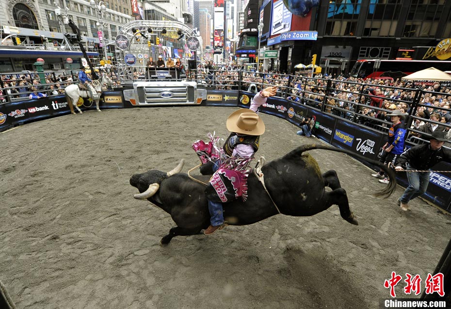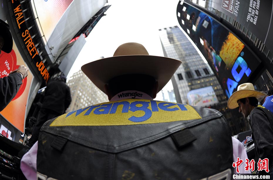 當地時間10月15日,10名美國職業騎牛大賽的頂尖選手在紐約時報廣場上演了一場精彩的騎牛大賽,為將于10月20日至24日在美國拉斯維加斯舉行的2010職業騎牛總決賽造勢。