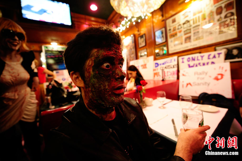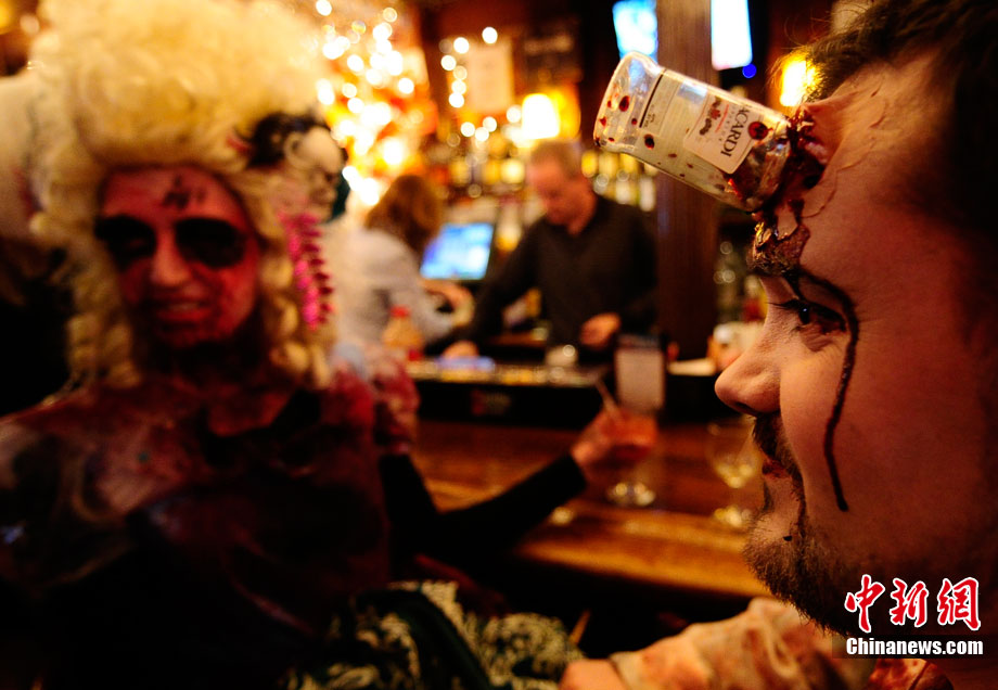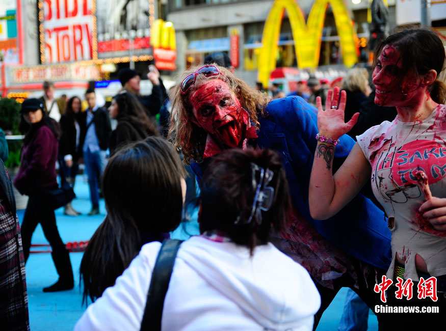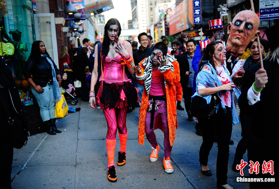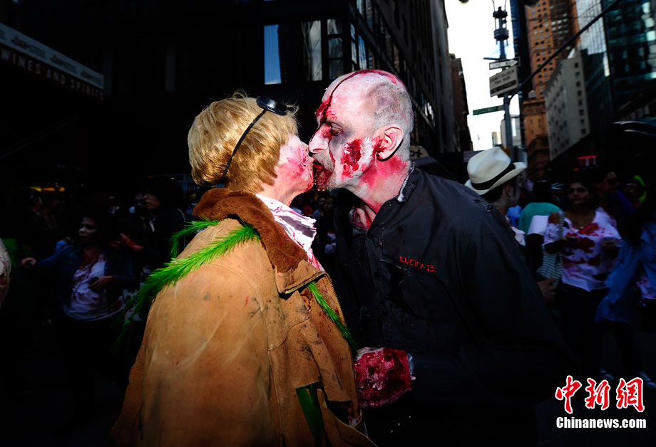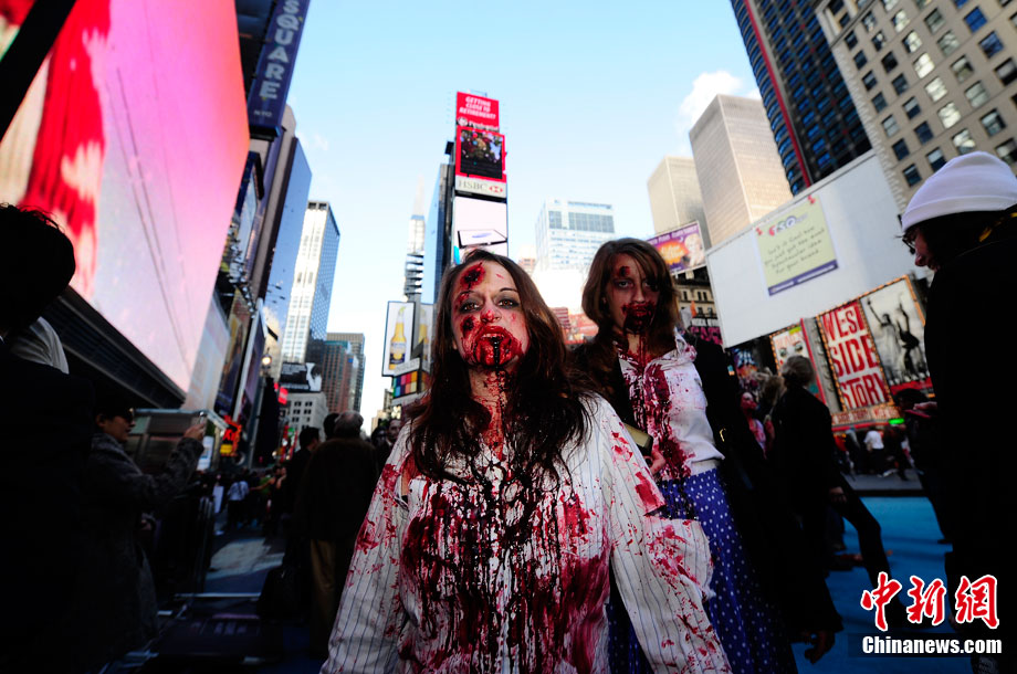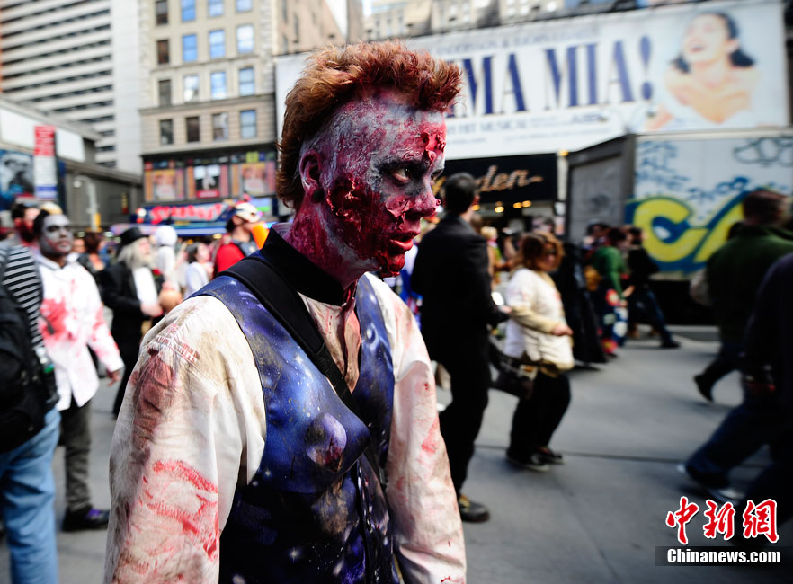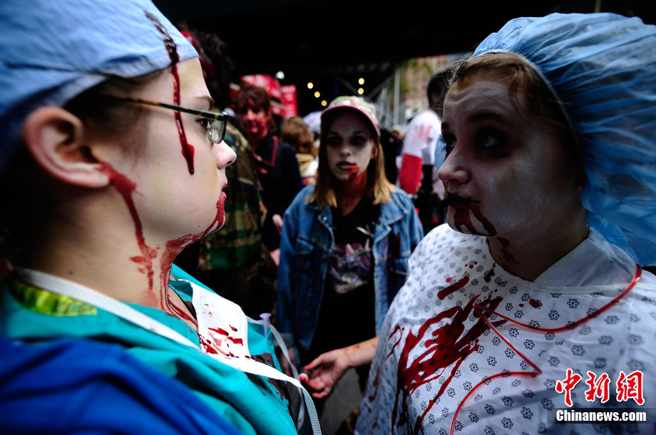 當地時間10月16日,美國紐約曼哈頓舉行了盛大的僵尸大游行。數百名狂歡者將自己打扮成僵尸模樣嚇唬路上的民眾。