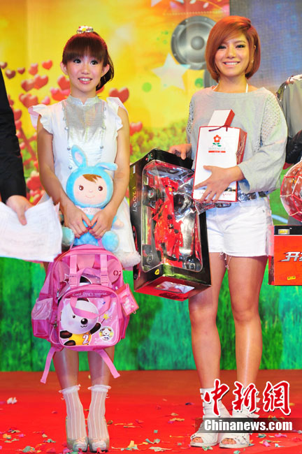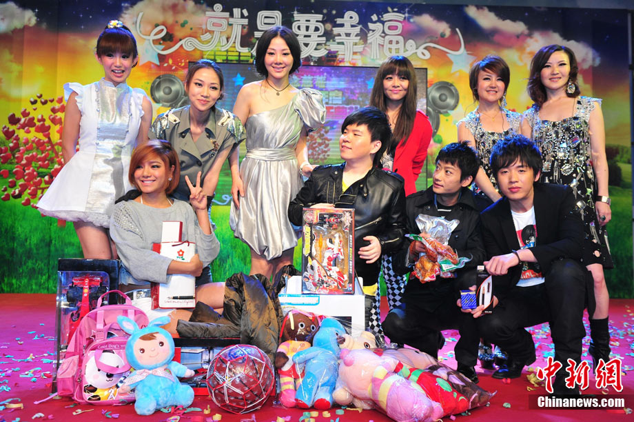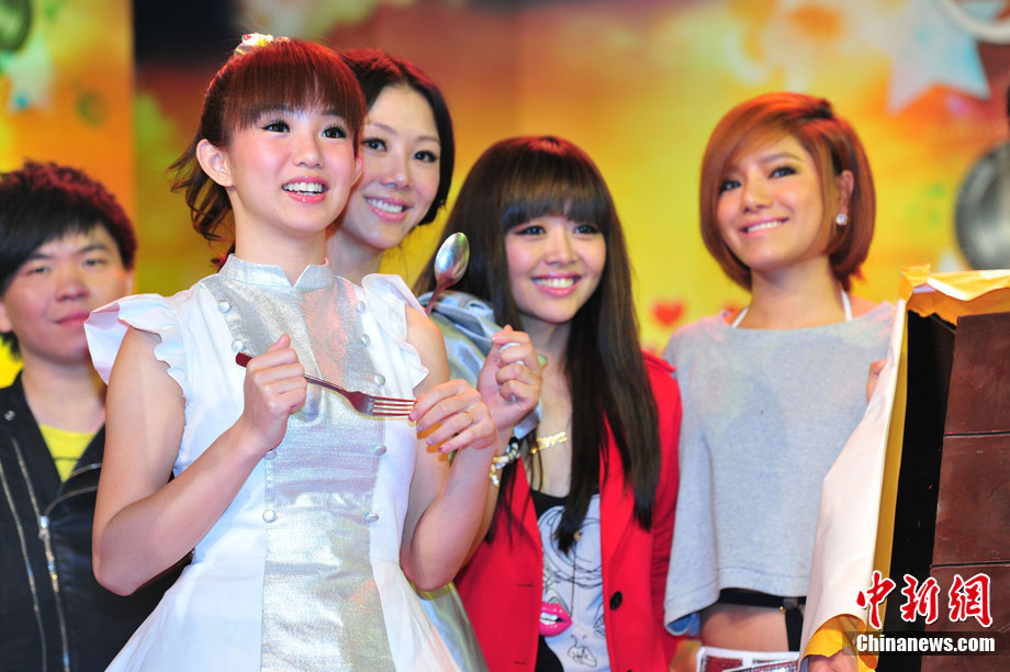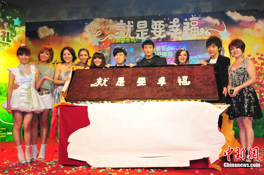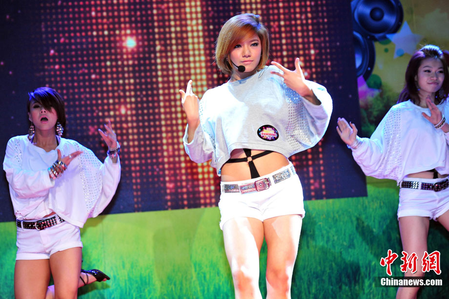 10月17日,2010年度北京流行音樂典禮歡唱會啟動儀式在京舉行,宣告“中歌榜”年度盤點正式啟動。江映蓉、臺灣“奶油甜心”郭書瑤、王箏、黃琦雯、常石磊等樂壇的新生力量到場助陣,共同品嘗一塊重達8公斤的巨型巧克力,巧克力上的“就是要幸!弊謽右彩潜灸甓鹊涠Y口號。圖為江映蓉在現場勁歌熱舞。中新社記者 李學仕 攝