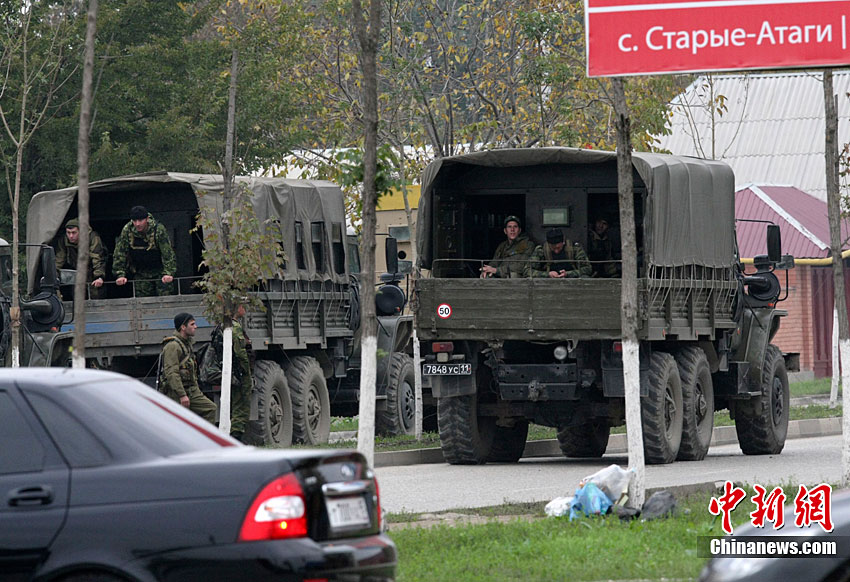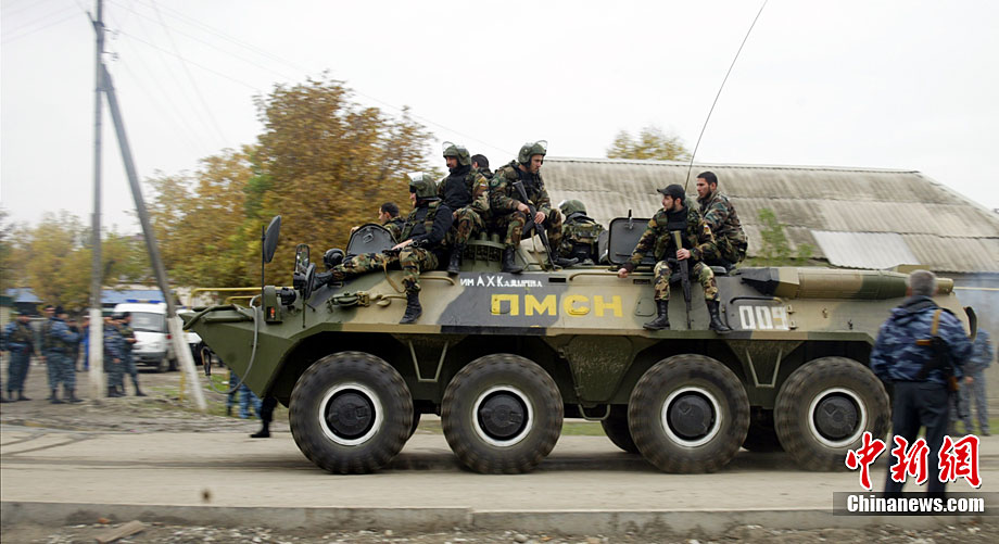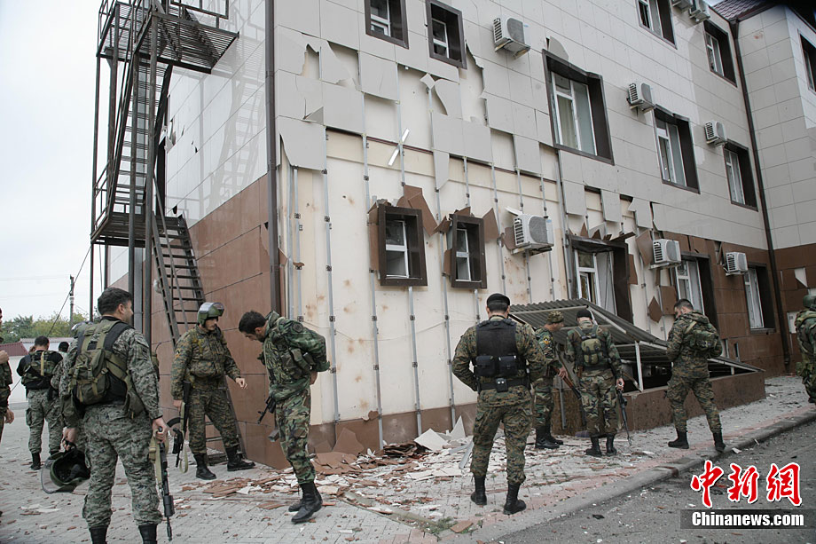 當地時間10月19日,俄羅斯車臣共和國首府格羅茲尼市列寧區的車臣議會大樓遭到武裝分子襲擊,造成2人死亡。圖為安全部隊在消滅完襲擊份子后,準備撤離議會大樓。