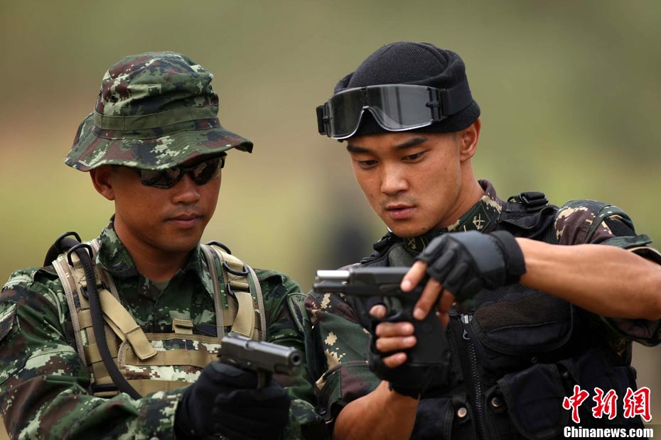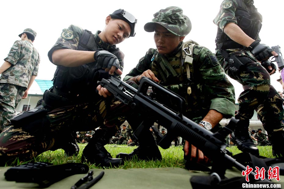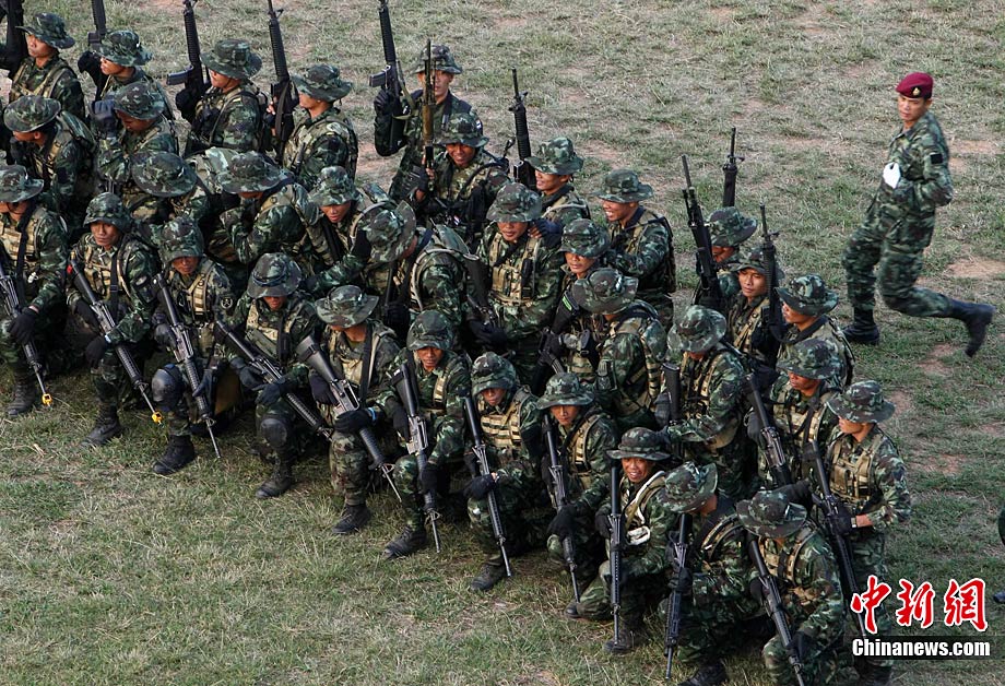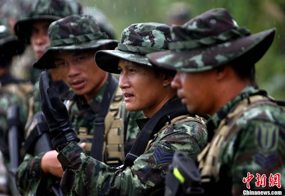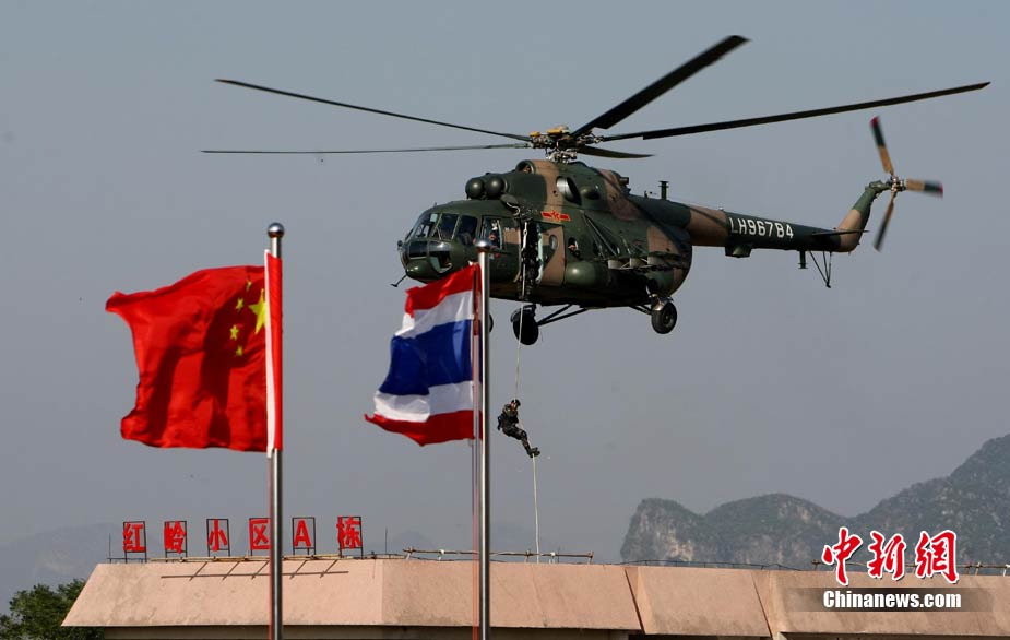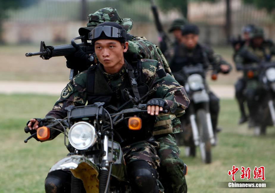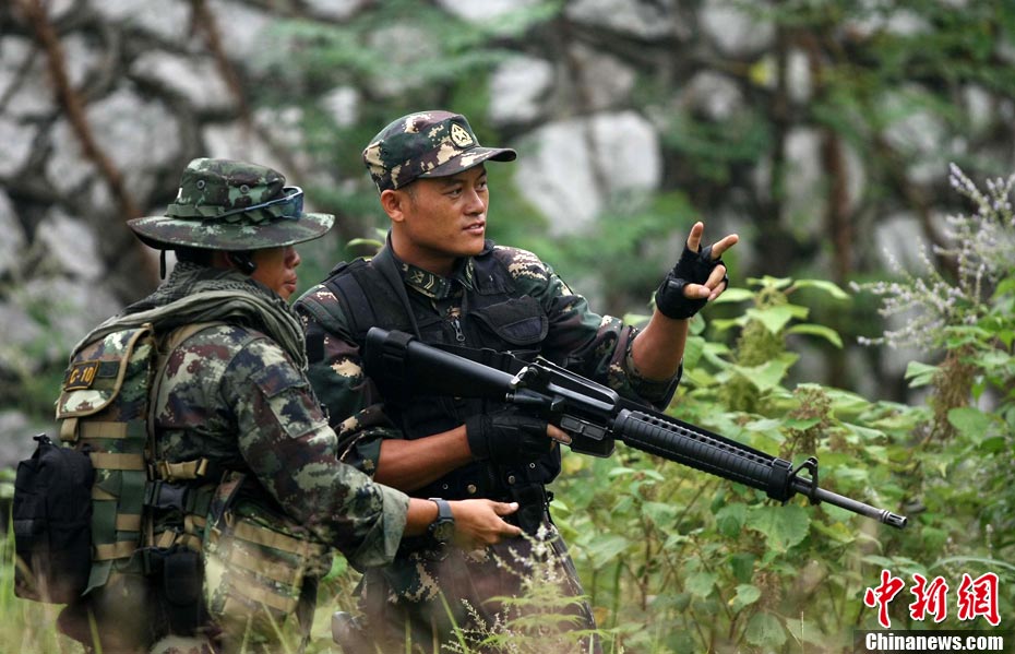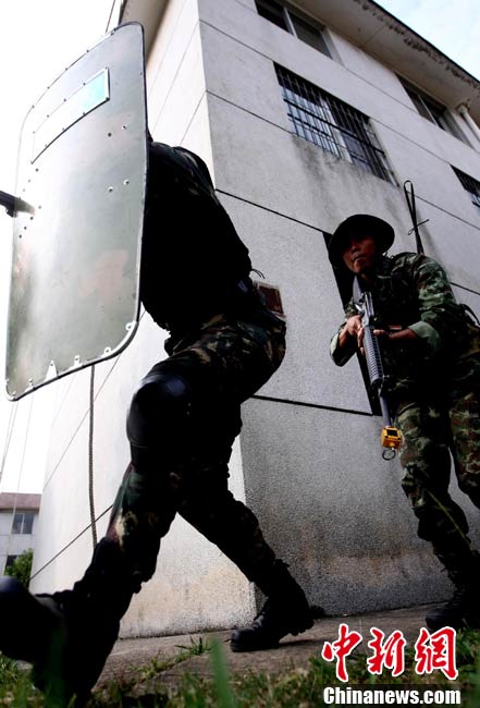 10月19日,“突擊-2010”中泰反恐聯訓在廣州軍區“紅嶺”合同戰術訓練基地舉行“獵鼬”行動實兵綜合演練,圍繞“城市聯合反恐行動”這一課題,演練了快速封鎖、偵搜排查、隔離疏散、立體突擊4個行動。演練模擬一名為“臭鼬”的國際恐怖組織在泰國制造暴力恐怖活動后,秘密潛入中國G市紅嶺小區,企圖在XX地區領導人峰會期間繼續制造恐怖事件,干擾峰會順利進行。中泰兩國政府依據聯合反恐協議,決定成立聯合指揮機構,抽調特種部隊精銳力量組成“獵鼬突擊隊”,共同進行反恐作戰任務。 中新社記者 杜洋 攝