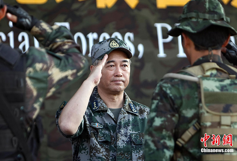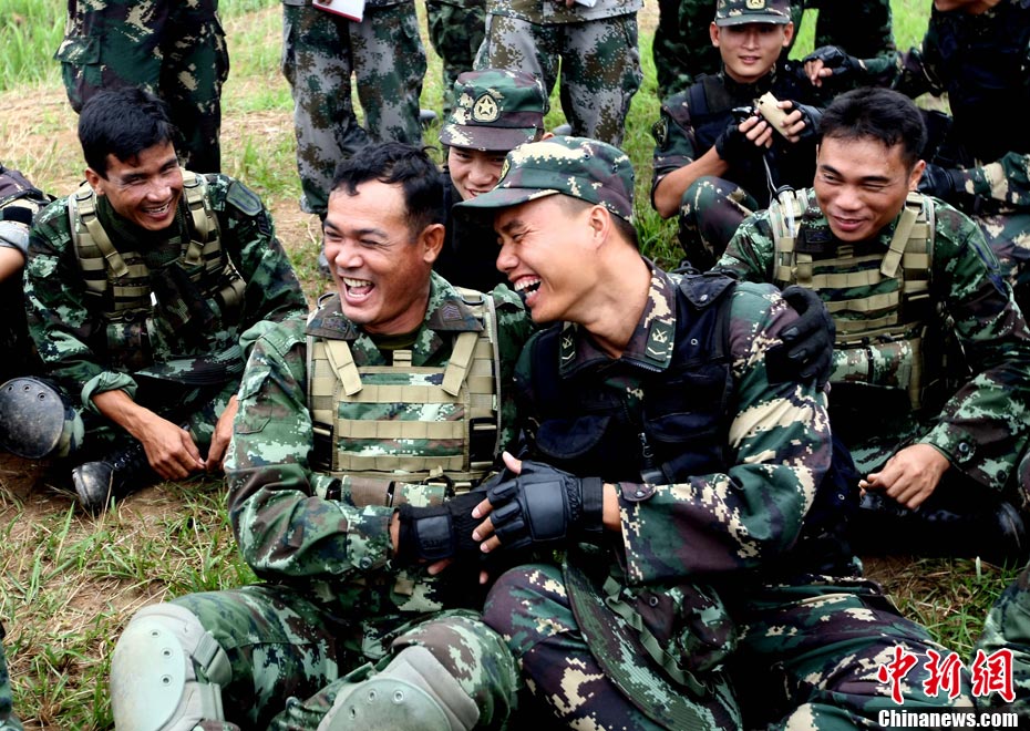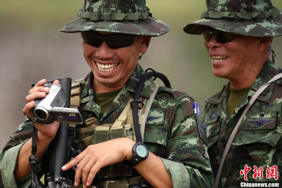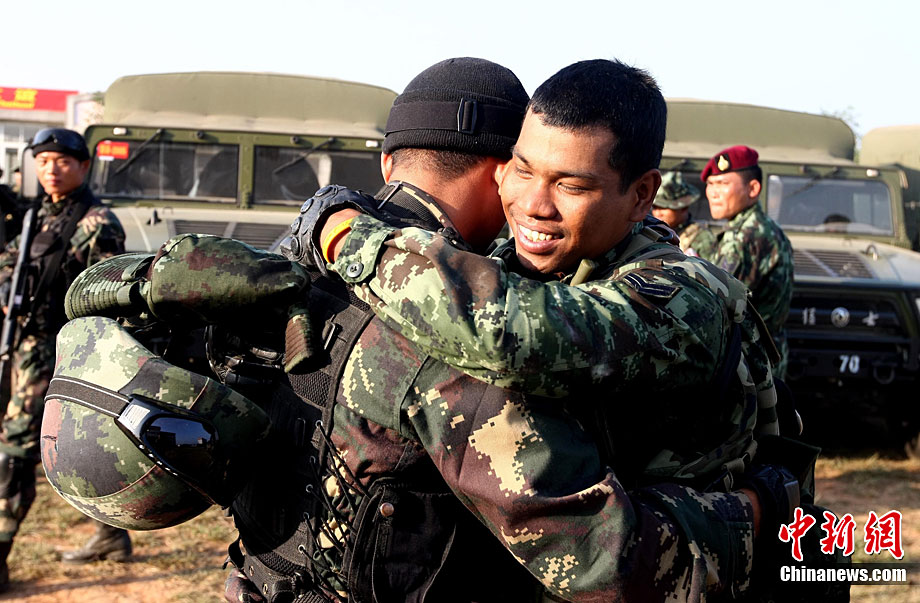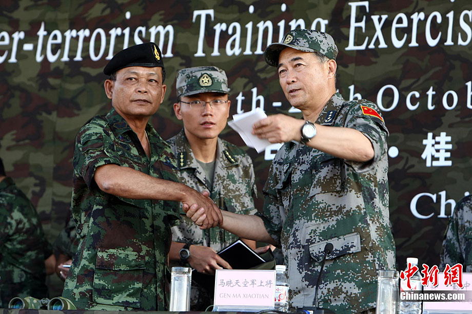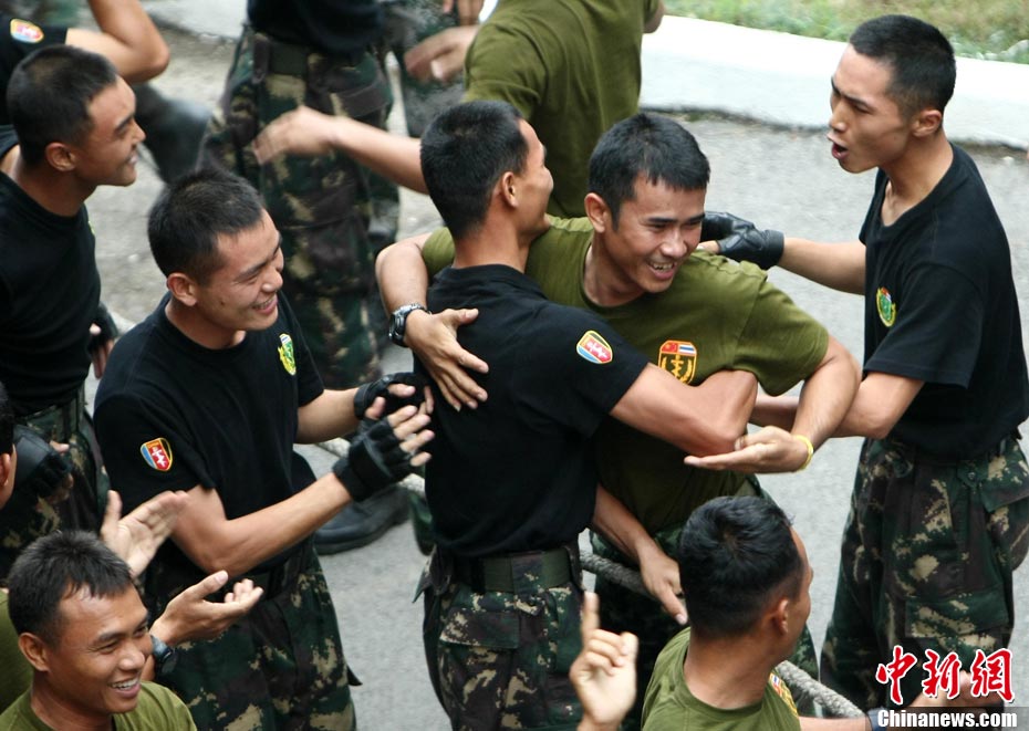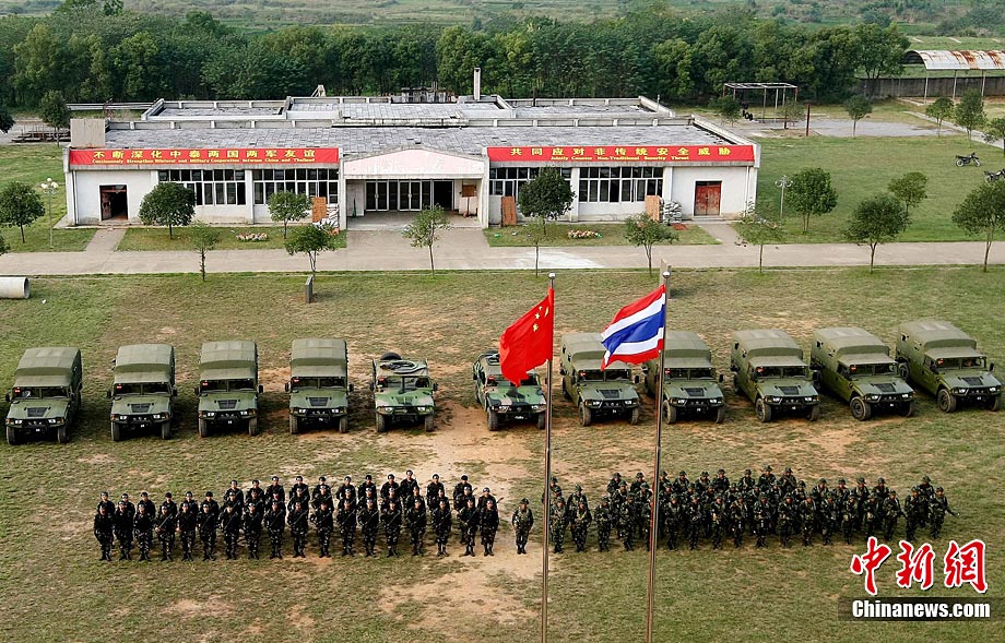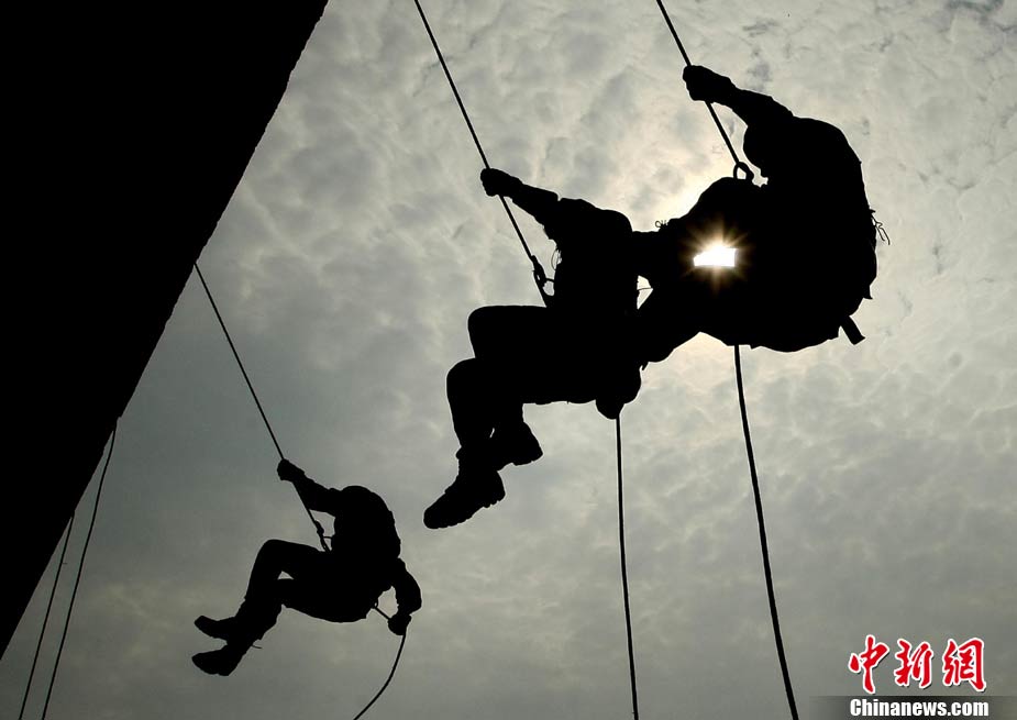 10月19日,“突擊-2010”中泰反恐聯訓在廣州軍區“紅嶺”合同戰術訓練基地舉行“獵鼬”行動實兵綜合演練,圍繞“城市聯合反恐行動”這一課題,演練了快速封鎖、偵搜排查、隔離疏散、立體突擊4個行動。演練模擬一名為“臭鼬”的國際恐怖組織在泰國制造暴力恐怖活動后,秘密潛入中國G市紅嶺小區,企圖在XX地區領導人峰會期間繼續制造恐怖事件,干擾峰會順利進行。中泰兩國政府依據聯合反恐協議,決定成立聯合指揮機構,抽調特種部隊精銳力量組成“獵鼬突擊隊”,共同進行反恐作戰任務。 中新社記者 杜洋 攝